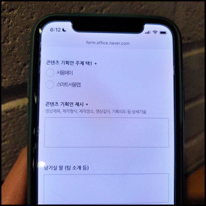 지원 링크를 보시면 이렇게 팀 명, 팀 대표자, 전체 팀원 같은 여러 항목을 입력하시면 됩니다. 경력사항도 작성하셔야 하며 활동분야 1~2지방 선택하셔야 합니다. 콘텐츠 기획안 주제의 경우 (1) 서울페이 (2) 스마트서울맵 중에 하나 선택하셔야 하며 콘텐츠 기획안 제시에 대해서는 영상제목, 제작형식 등에 대하여 작성하시면 됩니다.