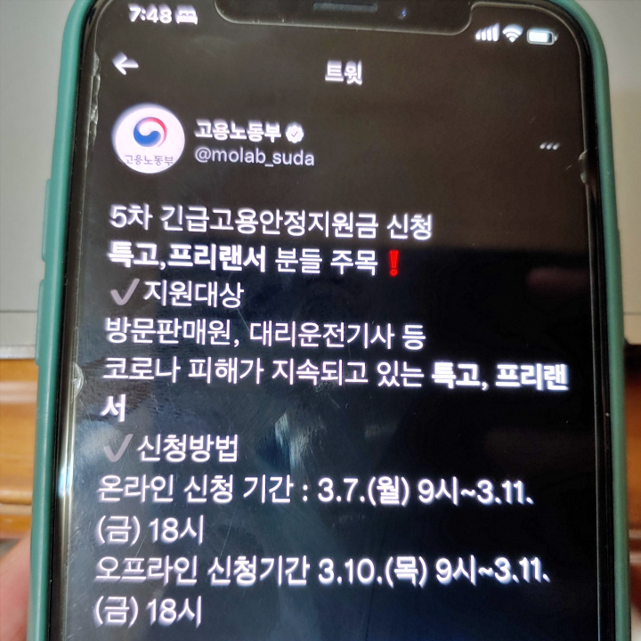 [사진 = 고용노동부 공식 트위터에서는 5차 긴급고용안정지원금 신청 관련 게시물을 올렸습니다. 특고 프리랜서 해당되나 일부 업종은 신청할 수 없습니다. (C) 고용노동부 공식 트위터]