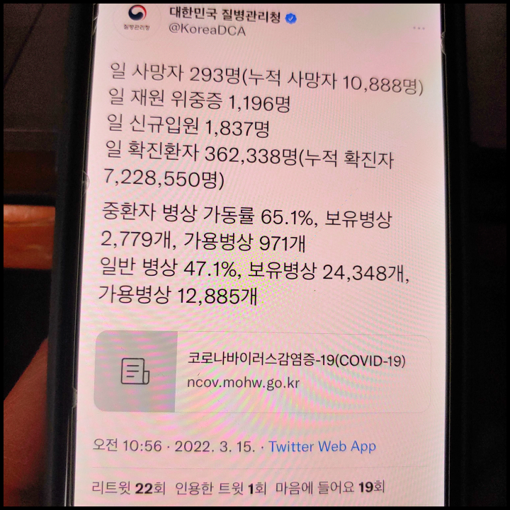 [사진 = 대한민국 질병관리청 공식 트위터에서는 3월 15일 오전에 올린 게시물을 통해 하루 확진자 362,338명(누적 확진자 7,228,550명)이라고 밝혔습니다. 3월 15일 오전 0시 기준 확진자로 보입니다. (C) 대한민국 질병관리청 공식 트위터]