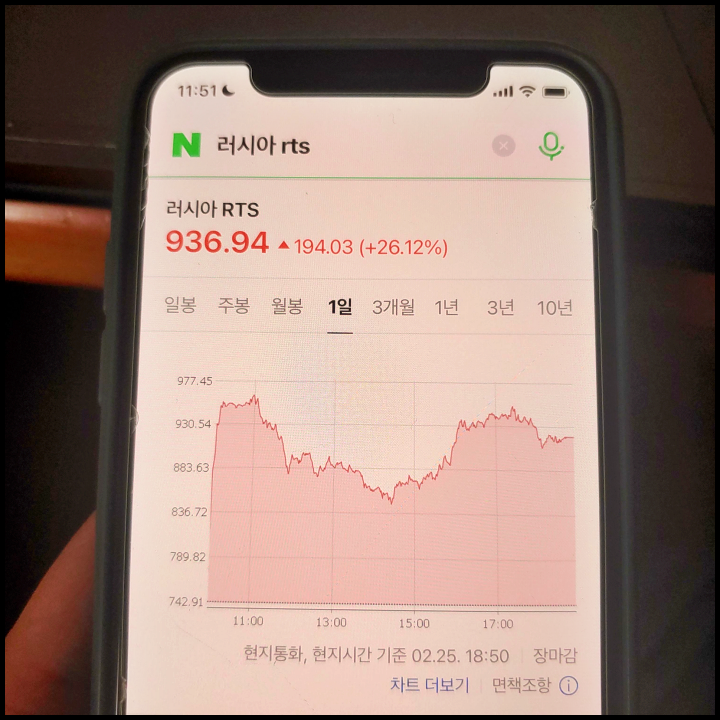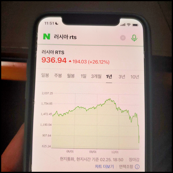 [사진 = 최근에 러시아 주식 관심 가졌던 분들이라면 러시아 50개 주요 종목을 다루는 러시아 RTS 눈여겨 보셨을 듯 합니다. 최근 3개월 및 1년 추이 중에서 최근에 최저가 기록했습니다. 전날에는 미국 금리인상 불확실성 해소 때문인지 26.12% 올랐으나 그동안 너무 크게 폭락했던 영향이 있습니다. 그만큼 러시아 경제 상황이 안좋았습니다. (C) 네이버 앱]