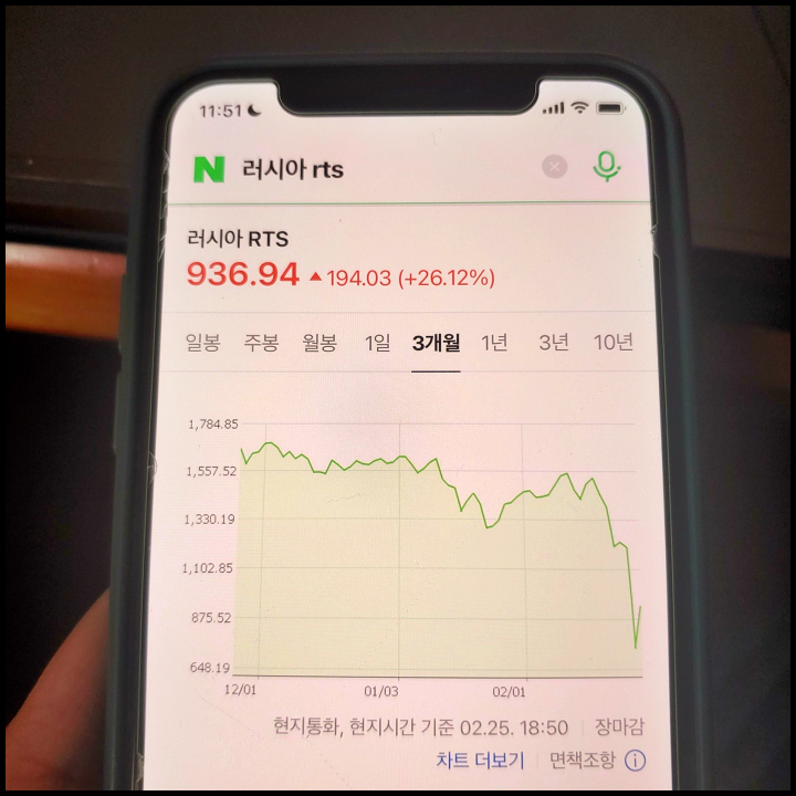 [사진 = 최근에 러시아 주식 관심 가졌던 분들이라면 러시아 50개 주요 종목을 다루는 러시아 RTS 눈여겨 보셨을 듯 합니다. 최근 3개월 및 1년 추이 중에서 최근에 최저가 기록했습니다. 전날에는 미국 금리인상 불확실성 해소 때문인지 26.12% 올랐으나 그동안 너무 크게 폭락했던 영향이 있습니다. 그만큼 러시아 경제 상황이 안좋았습니다. (C) 네이버 앱]