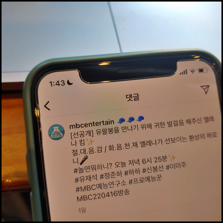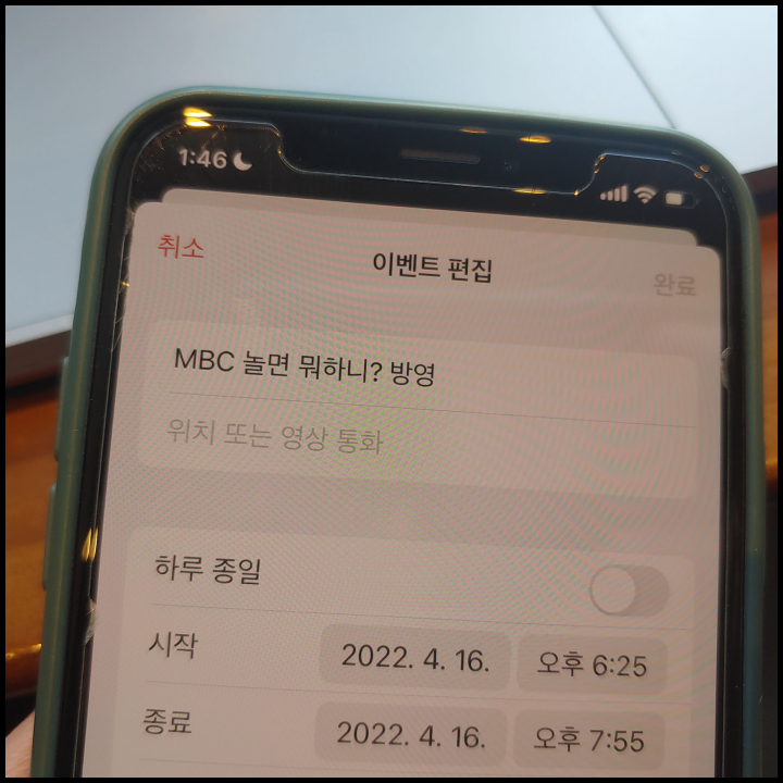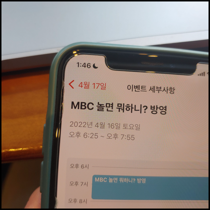 [사진 = 2022년 4월 16일 MBC 놀면뭐하니 방영됐습니다. 사진은 저의 스마트폰 달력이며 2022년 4월 16일을 가리킵니다. 이번 방영분에서 WSG워너비 참가자 4명의 블라인드 오디션 영상이 공개되면서 많은 누리꾼들의 주목을 끌었습니다. 그중에는 시청자들이 정체를 유력하게 거론하는 인물들이 있습니다. 놀면뭐하니 이성경 이보람 여부가 눈길을 끄는 가운데 또 다른 노래 고수로 보이는 놀면뭐하니 소피 마르소 박혜원 여부가 주목을 끌게 됐습니다. 공교롭게도 이보람과 박혜원은 MBC 복면가왕에서 가왕 달성했던 공통점이 있습니다. (C) 나이스블루]