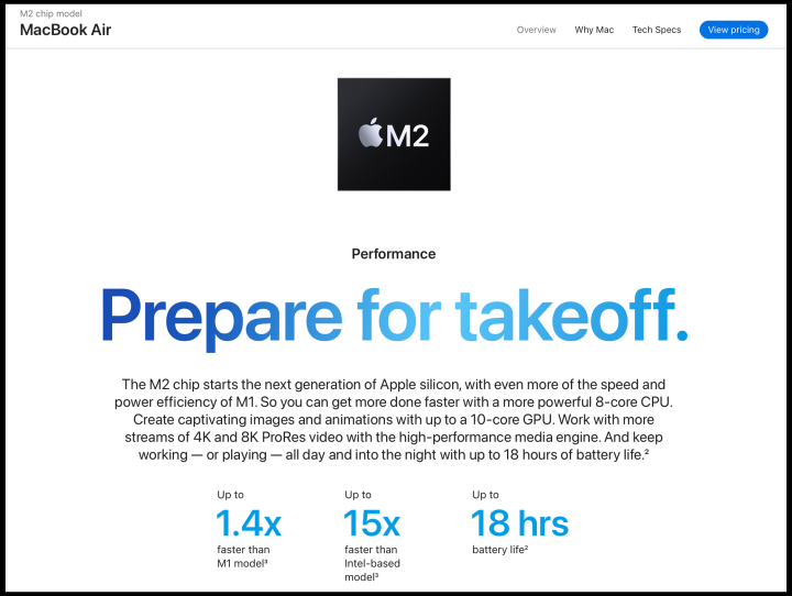 [사진 = 맥북에어 M2 가장 눈에 띄는 점은 M2 칩 탑재되었다는 점입니다. M1 칩 탑재 제품에 비해서 최대 1.4배 더 빠른 속도를 구현합니다. 그와 더불어 Intel 기반 모델 대비 최대 15배 더 빠른 속도를 구현합니다. 이전에 M1 칩 등장했을 때에 비해서 성능이 많이 좋아졌는데 이번에 M1에서 업그레이드 된 칩이 나온 셈입니다. 동영상 편집 및 이미지 필터 및 효과 등에서도 M2가 M1을 능가합니다. (C) 애플 공식 홈페이지(apple.com)]
