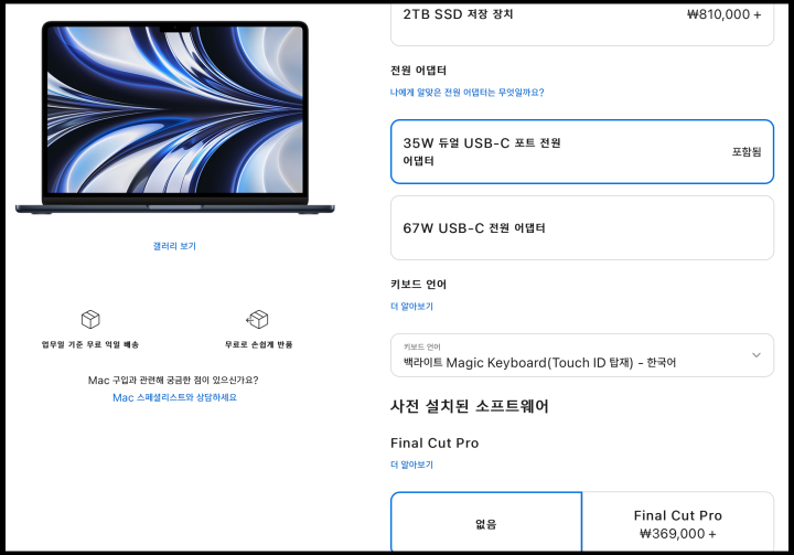 [사진 = 맥북에어 M2 가격 8코어 또는 10코어 GPU에 따라 다릅니다. 각각 최소 169만 원, 최소 209만 원부터 시작합니다. RAM 및 저장 용량에 따라 가격이 다르며 10코어 GPU의 경우 전원 어댑터 가격은 동일하나 8코어 GPU는 옵션에 따라 27,000원 차이가 있습니다. 만약 애플의 동영상 편집 프로그램 파이널 컷 프로 이용하고 싶다면 369,000원 추가하셔야 합니다. (C) 애플 공식 홈페이지(apple.com)]