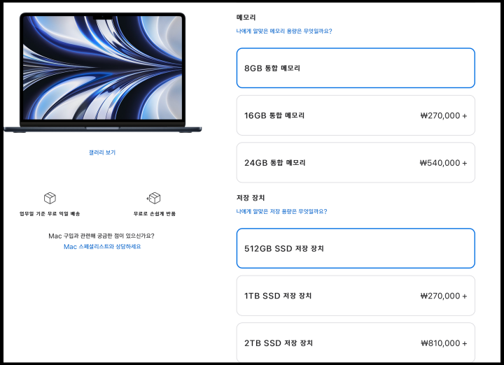 -RAM : 최소 8GB(16/24GB, 가격 다름)