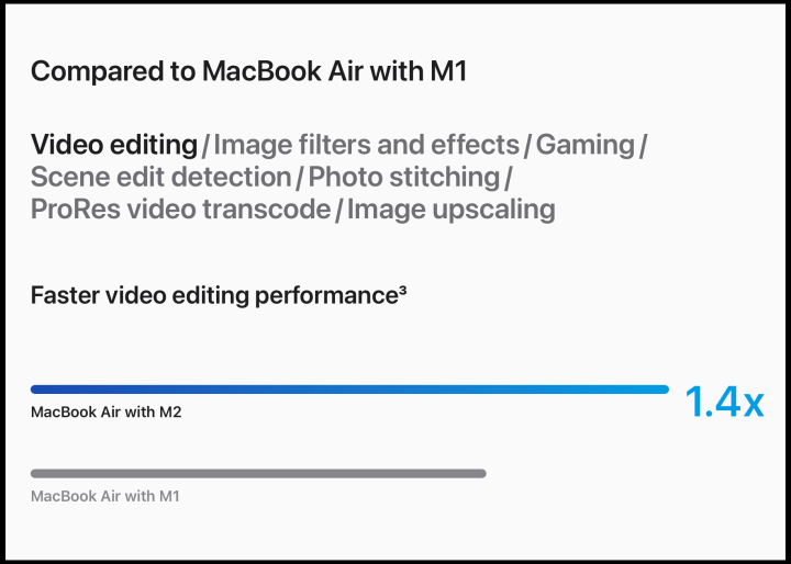 [사진 = 맥북에어 M2 가장 눈에 띄는 점은 M2 칩 탑재되었다는 점입니다. M1 칩 탑재 제품에 비해서 최대 1.4배 더 빠른 속도를 구현합니다. 그와 더불어 Intel 기반 모델 대비 최대 15배 더 빠른 속도를 구현합니다. 이전에 M1 칩 등장했을 때에 비해서 성능이 많이 좋아졌는데 이번에 M1에서 업그레이드 된 칩이 나온 셈입니다. 동영상 편집 및 이미지 필터 및 효과 등에서도 M2가 M1을 능가합니다. (C) 애플 공식 홈페이지(apple.com)]