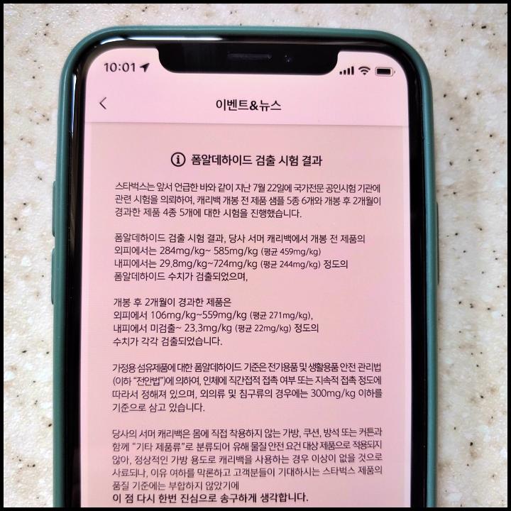 결국에는 스타벅스 서머캐리백 교환 결정했습니다. 발암물질 이슈가 웬지 느낌이 좋지 않았습니다. 여기에 오징어 냄새 논란까지 제기된 것을 보면 '이 제품에 뭔가 있다'라는 것을 인지했습니다. 만약 해당 제품에 발암물질이 없더라도 오프라인에서 계속 들고 다니면 이를 바라보는 다른 사람들의 시선이 좋지 않을 것 같은 생각이 들었습니다. 워낙 한국에서 스타벅스 제품이 많은 사람들 앞에서 돋보이게 하는 아우라가 있으니 말입니다. 지금 시점에서 바라보면 교환하길 잘했고 발암물질 검출은 사실로 밝혀졌습니다.