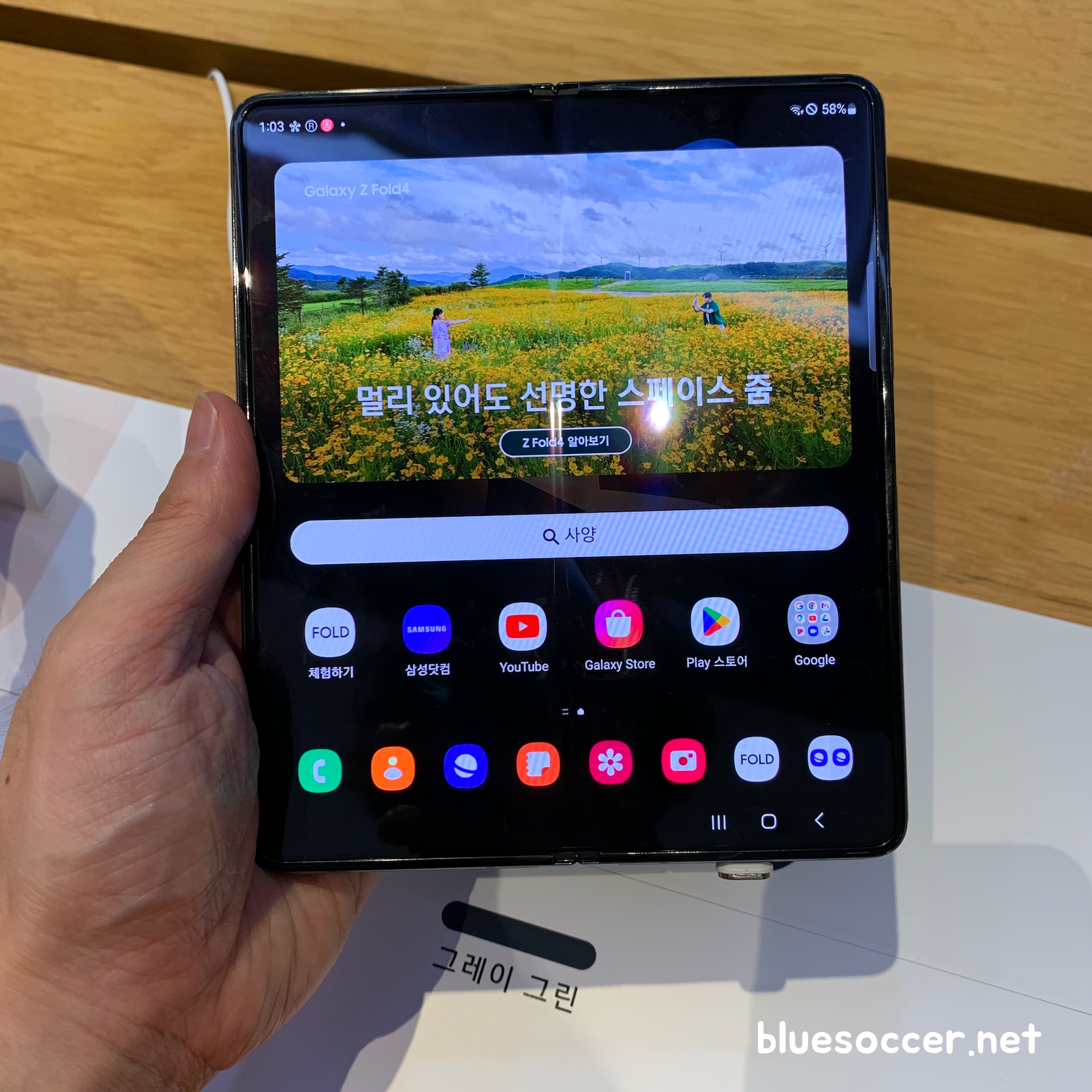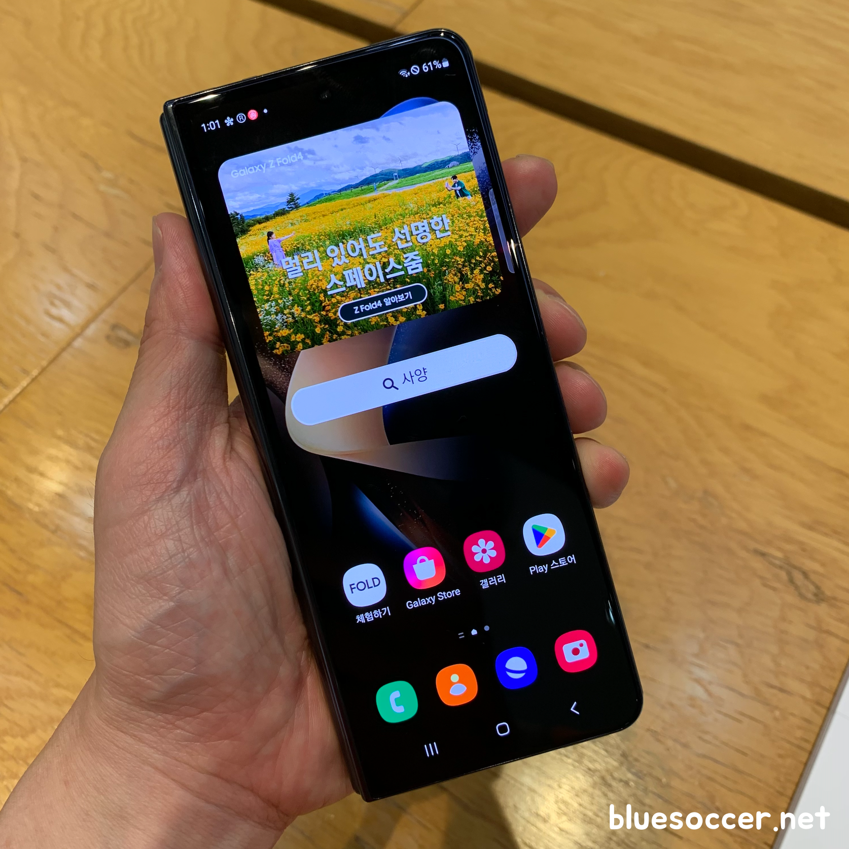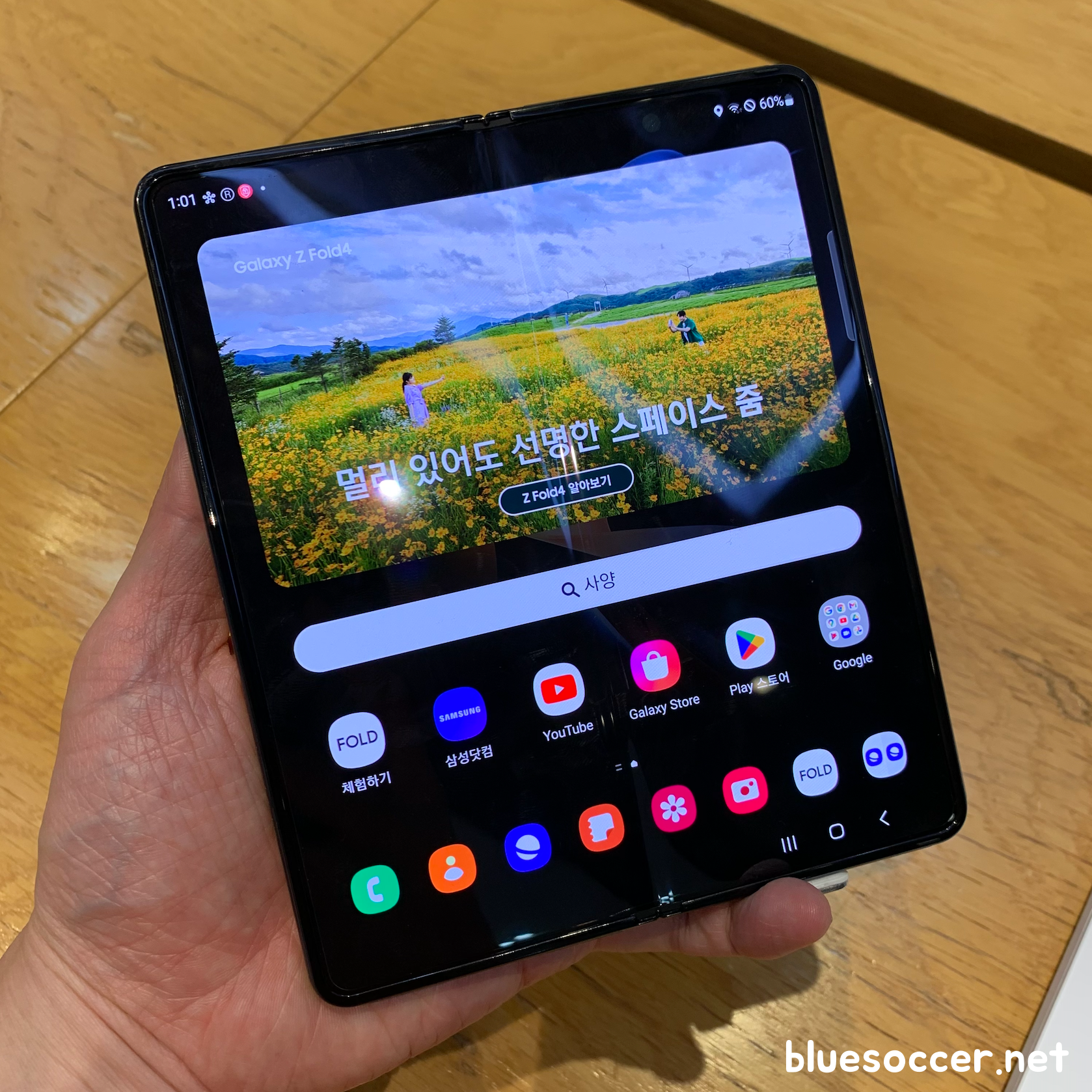 갤럭시 Z폴드4 팬텀 블랙 모델을 펼쳐봤습니다. 확실히 메인 디스플레이 크기가 넓습니다. 넷플릭스 및 유튜브 시청하실 때 화면 몰입감이 좋아지는 이점을 누릴 수 있습니다. 제품을 펼치면 커버 디스플레이에는 화면이 나오지 않는 것이 당연합니다. 메인 디스플레이가 그 역할을 하기 때문입니다. 이 제품의 최대 매력을 꼽으라면 광활한 메인 디스플레이라고 봅니다.