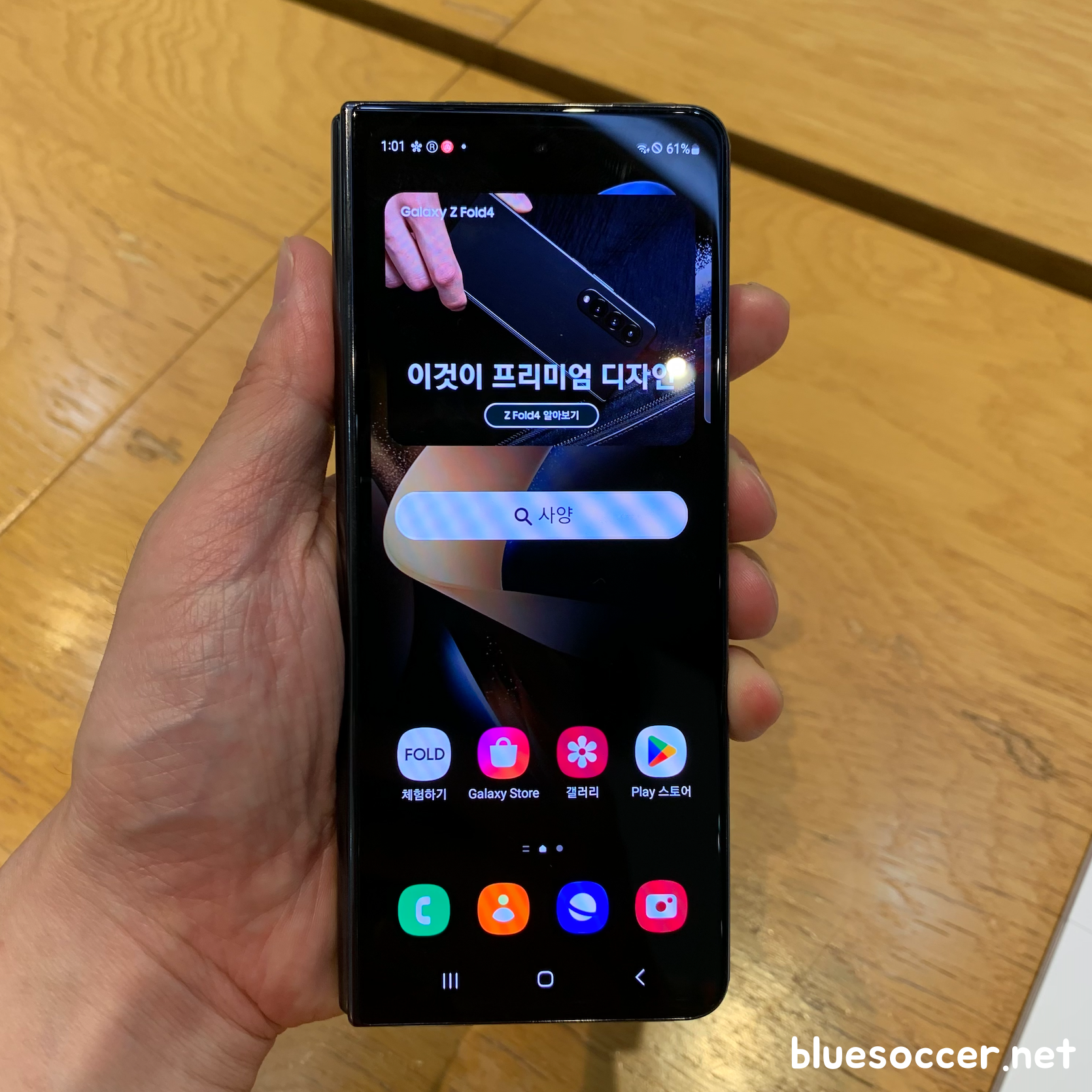 갤럭시 Z폴드4 팬텀 블랙 모델을 펼쳐봤습니다. 확실히 메인 디스플레이 크기가 넓습니다. 넷플릭스 및 유튜브 시청하실 때 화면 몰입감이 좋아지는 이점을 누릴 수 있습니다. 제품을 펼치면 커버 디스플레이에는 화면이 나오지 않는 것이 당연합니다. 메인 디스플레이가 그 역할을 하기 때문입니다. 이 제품의 최대 매력을 꼽으라면 광활한 메인 디스플레이라고 봅니다.