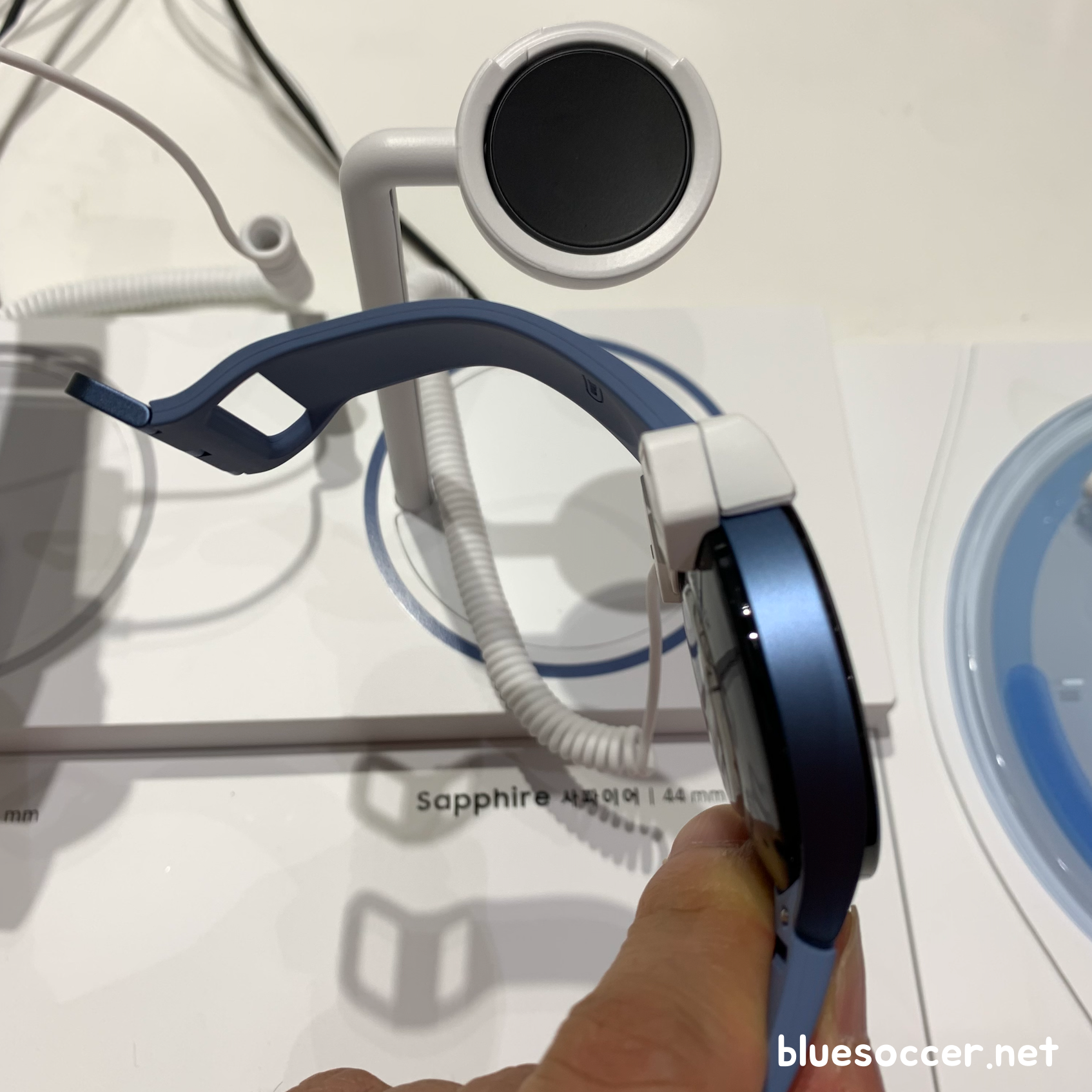 갤럭시워치5 44mm 색상 이렇습니다. 그라파이트 모델이 블랙에 가깝게 나왔고, 실버 모델이 화이트와 거의 비슷하게 나왔다면, 사파이어 모델은 짙은 블루에 가까워 보였습니다. 블랙이나 화이트가 그동안 수많은 전자제품에서 흔히 볼 수 있었던 색상이라는 점에서 사파이어 모델이 시선을 돌리기 쉽습니다. 물론 스트랩 색상만 다른 것은 아닙니다. 본체의 색상이 서로 다릅니다. 스트랩은 얼마든지 교체 가능하나 본체는 그렇지 않습니다. 이 제품을 계속 사용할 때까지 항상 봐야 하는 존재이기 때문입니다.
