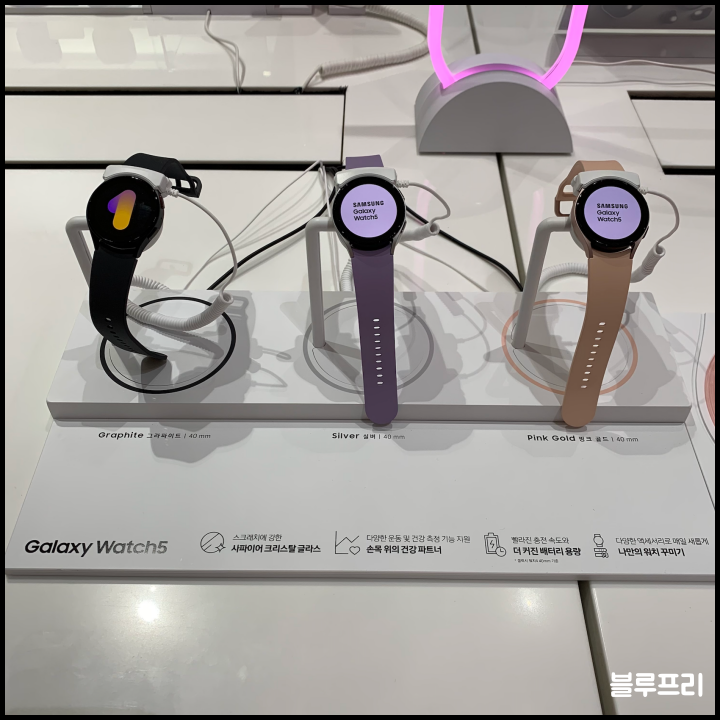 이번에는 갤럭시워치5 40mm 그라파이트 색상을 봤습니다. 실질적으로는 전형적인 블랙 계열의 제품이었습니다. 무난한 색상의 스마트워치를 이용하고 싶어하는 분들이 관심을 가질만한 제품이 될 것으로 보입니다. 어쩌면 어두운 색깔의 스마트폰을 선호하는 분들이 선택하기 쉬울 만한 제품일 수도 있겠다는 생각도 해봅니다. 현재 많은 사람들이 스마트워치 또는 손목 시계 이용하는 추세에서 합리적인 가격대로 이용하기 좋을 만한 제품은 갤럭시워치5 40mm 같습니다. 삼성전자 스마트폰 이용하는 분들이 주목할 만한 제품인 것 같습니다.