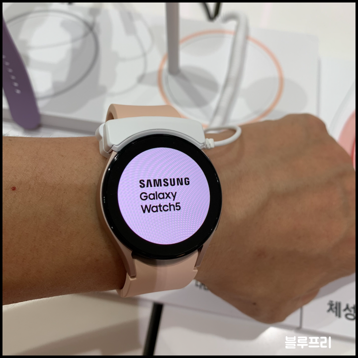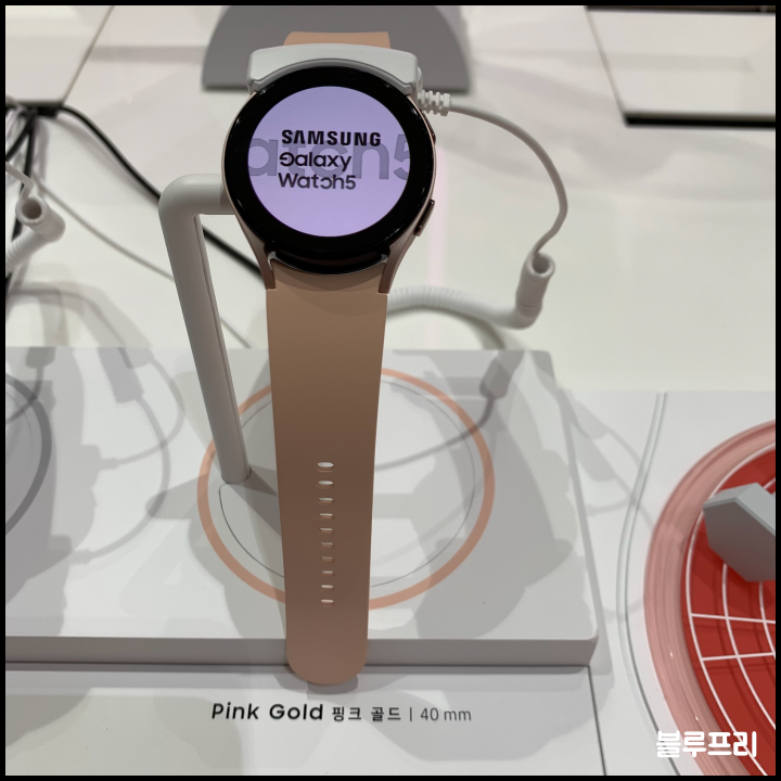 이번에 나온 갤럭시워치5 40mm 핑크골드 모습입니다. 알고보니 스트랩이 핑크이며 본체에서 골드 느낌이 많이 났습니다. 다른 색상들은 스트랩과 본체 색상이 똑같은데 이 제품은 느낌이 다르게 보였습니다. 그럼에도 여성 분들에게는 수요가 높을만한 제품 같았습니다. 실제로 지난해 하반기 출시된 갤럭시 Z플립3 스마트폰이 여성 분들에게 많은 인기를 끌었습니다. 최근 출시된 갤럭시 Z플립4 같은 경우에도 여성 분들에게 높은 관심을 끌 것으로 보이는데 해당 스마트폰과 함께 사용하기 좋을만한 스마트워치가 바로 갤럭시워치5이며 40mm에 핑크골드 색상이 있습니다.
