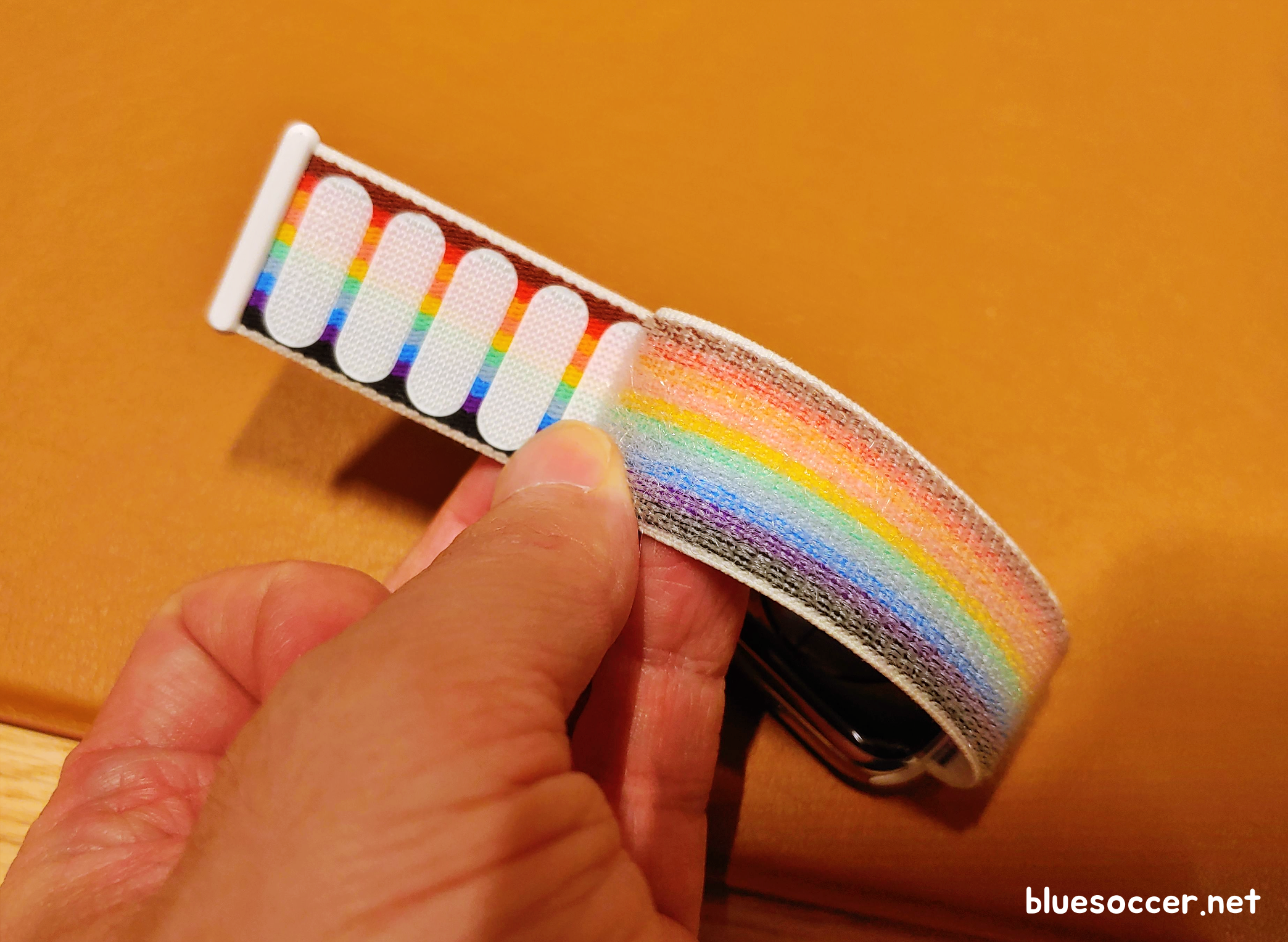이 제품은 부착 루프 형태로 착용하면 됩니다. 애플워치7 기본 모델 착용 방식과는 다릅니다. 저도 이 제품을 접하면서 '스트랩마다 착용 방식이 다를 수 있구나'라는 것을 느꼈습니다. 부착 공간 밑에는 PRIDE 2022 문구가 표기됐습니다. 2022년 출시된 제품입니다.
