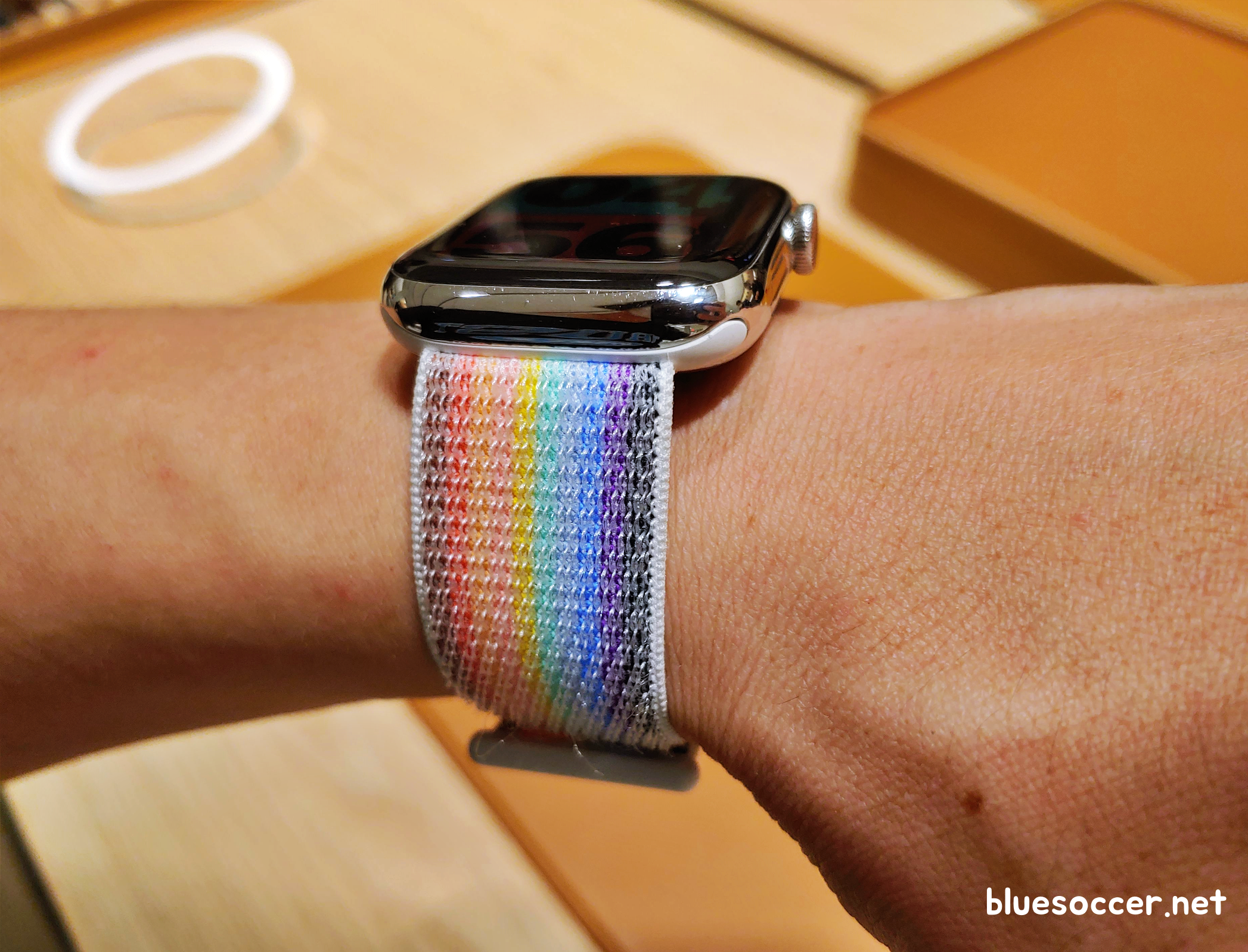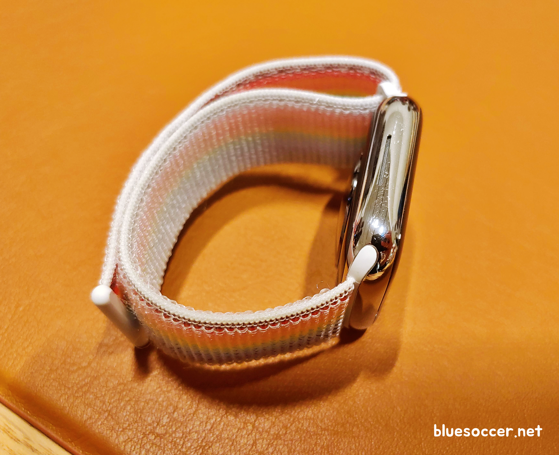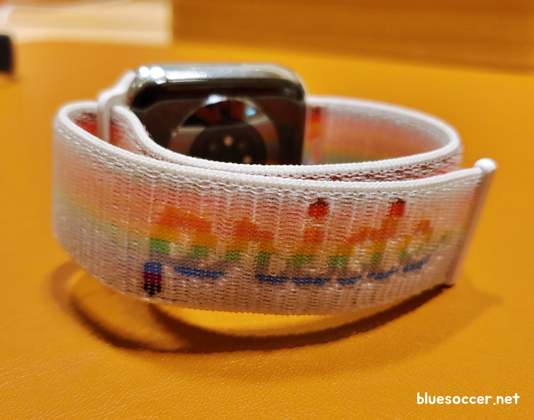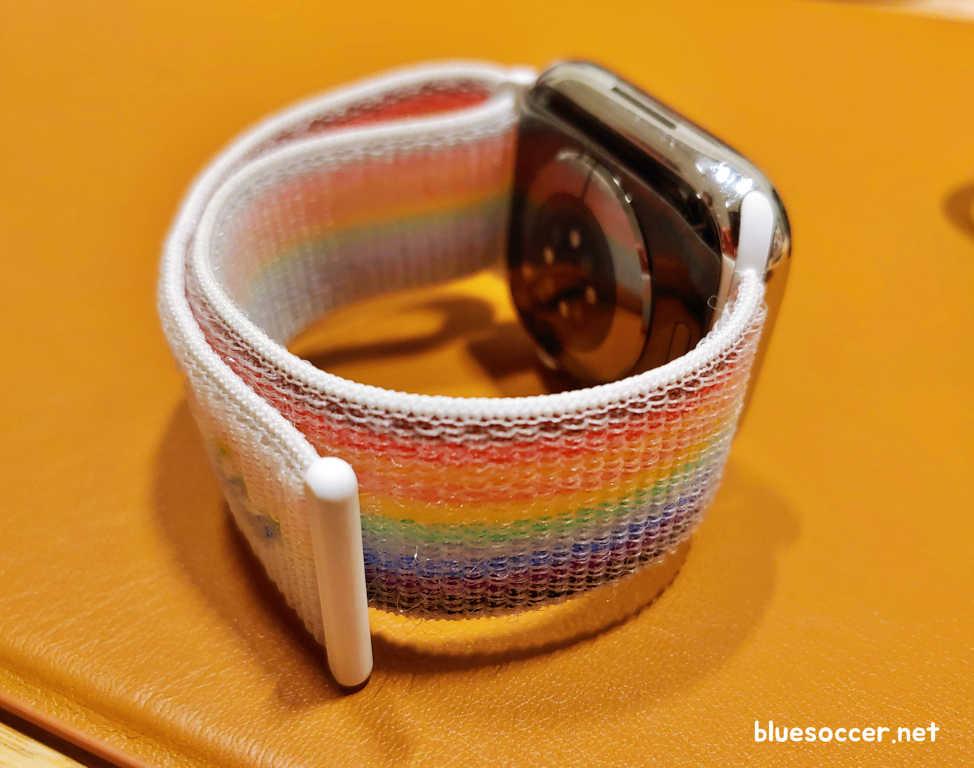 이 제품은 부착 루프 형태로 착용하면 됩니다. 애플워치7 기본 모델 착용 방식과는 다릅니다. 저도 이 제품을 접하면서 '스트랩마다 착용 방식이 다를 수 있구나'라는 것을 느꼈습니다. 부착 공간 밑에는 PRIDE 2022 문구가 표기됐습니다. 2022년 출시된 제품입니다.