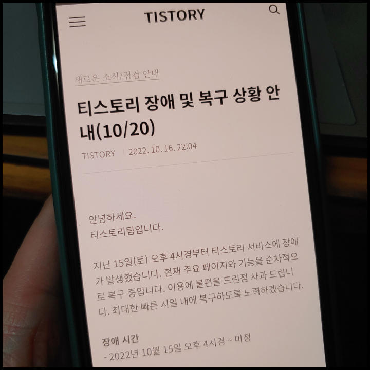 [사진 = 티스토리 측은 10월 16일 오후 10시 4분 장애 및 복구 상황 안내하며 사과했습니다. 복구는 10월 20일에도 계속됐던 것으로 보입니다. (C) 티스토리]