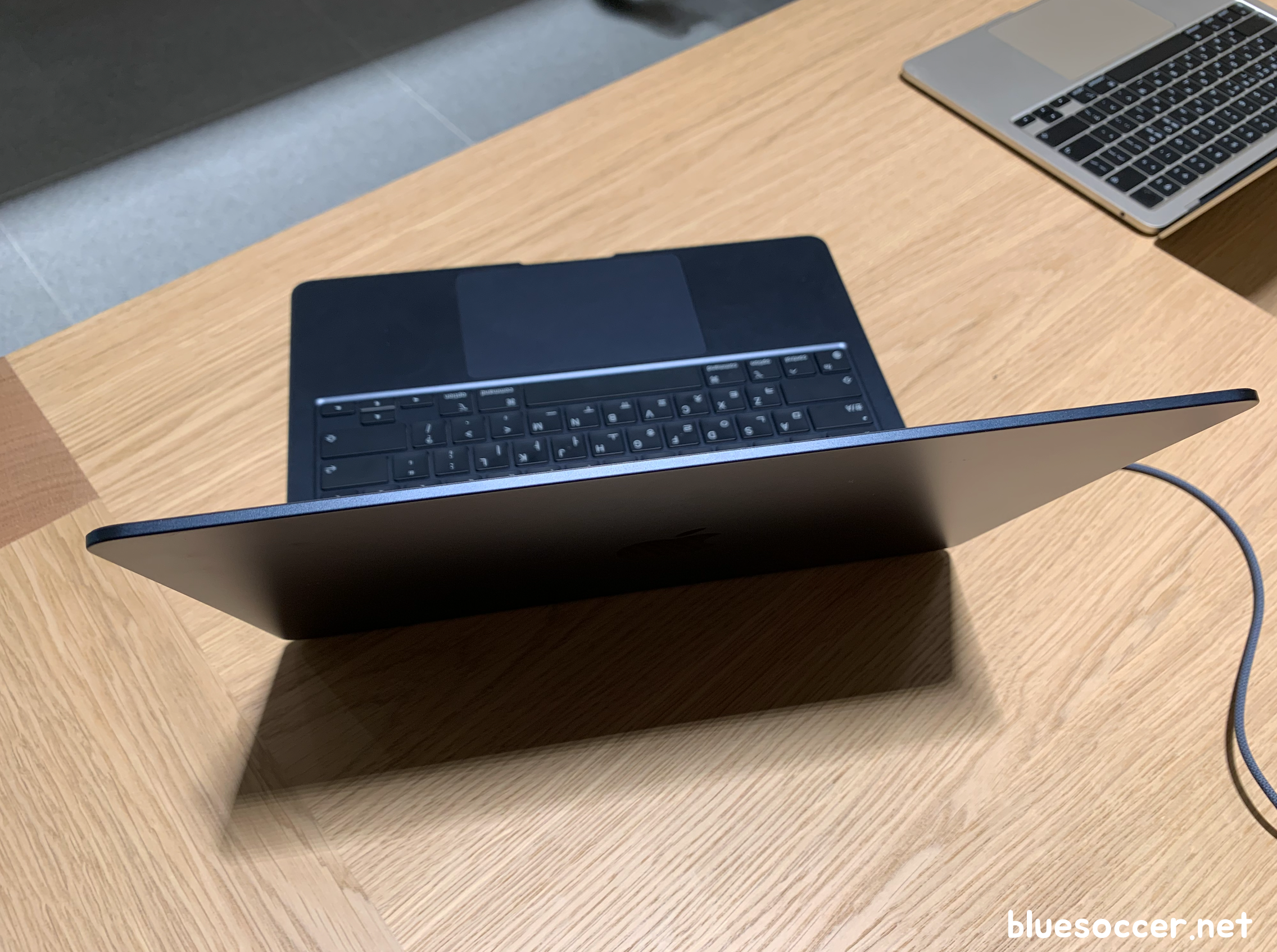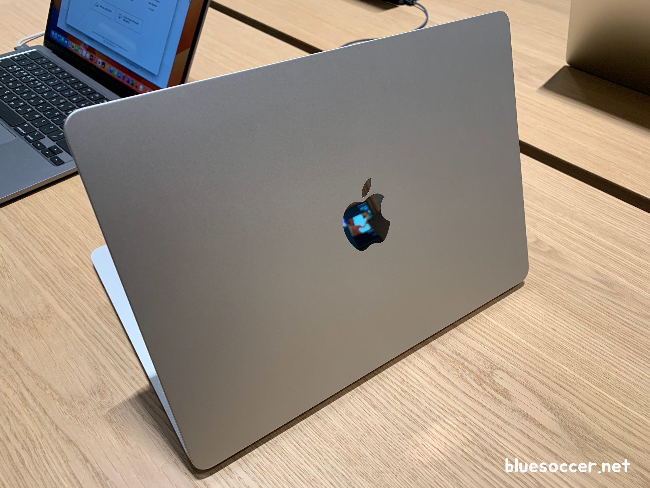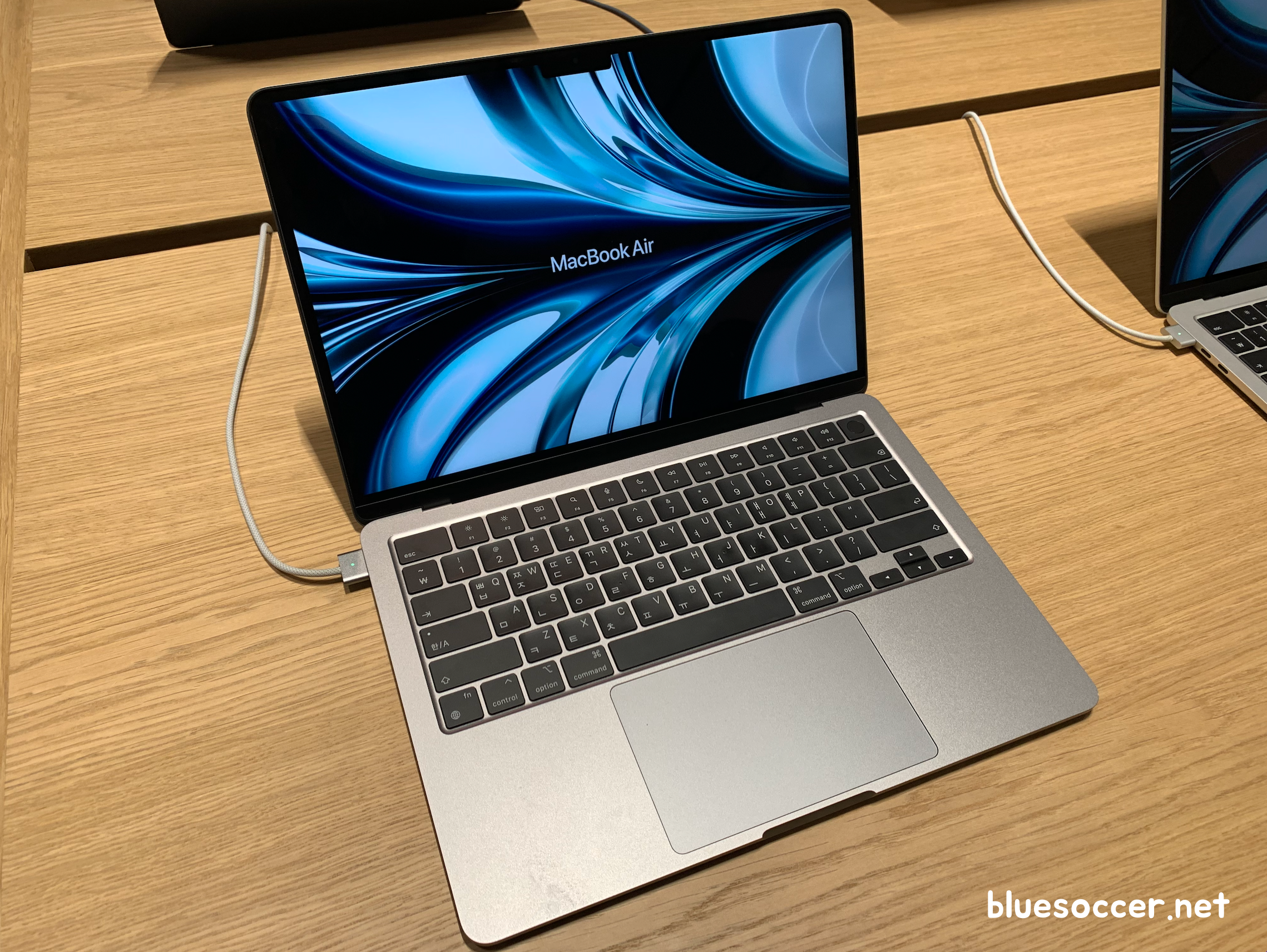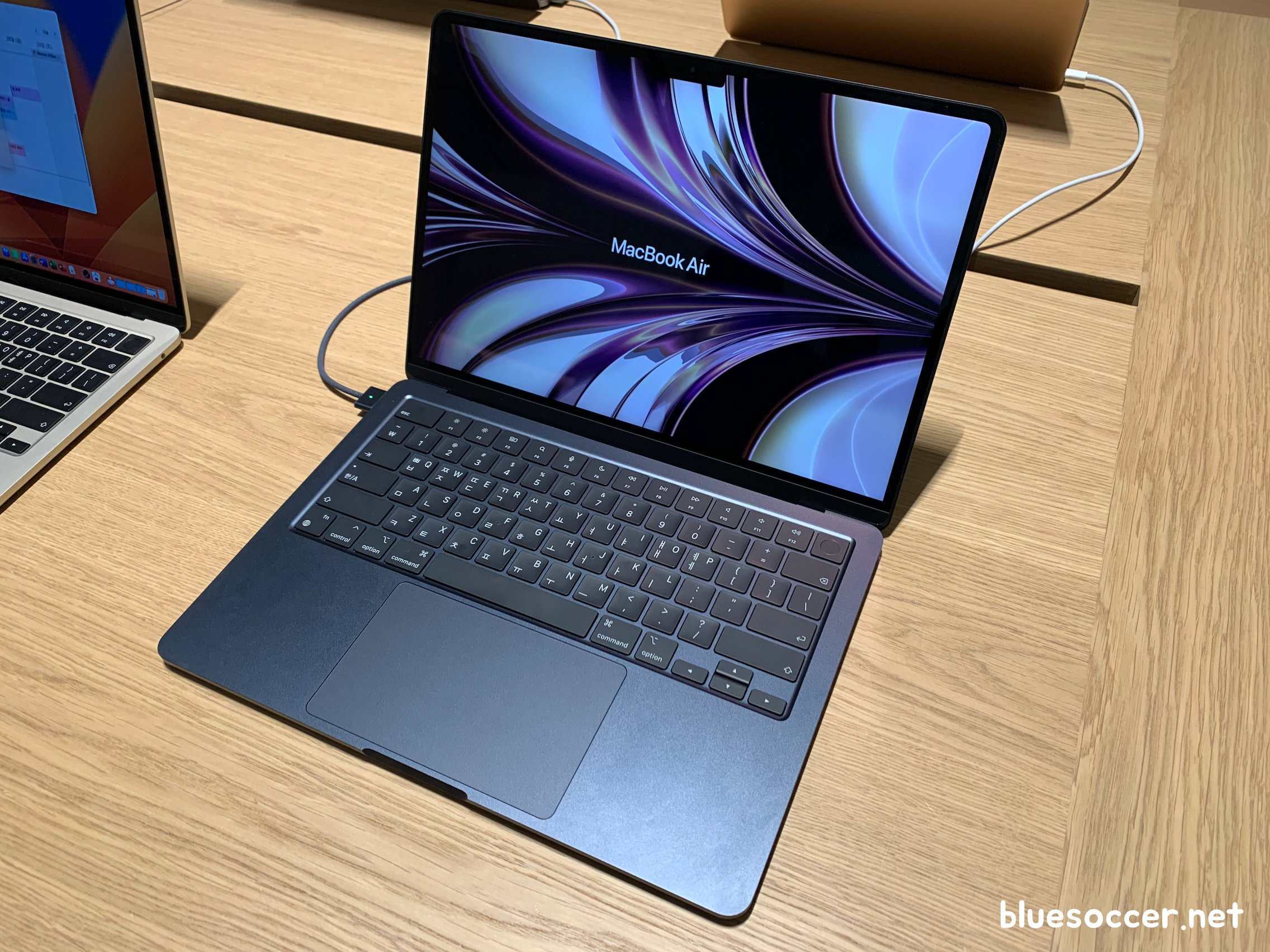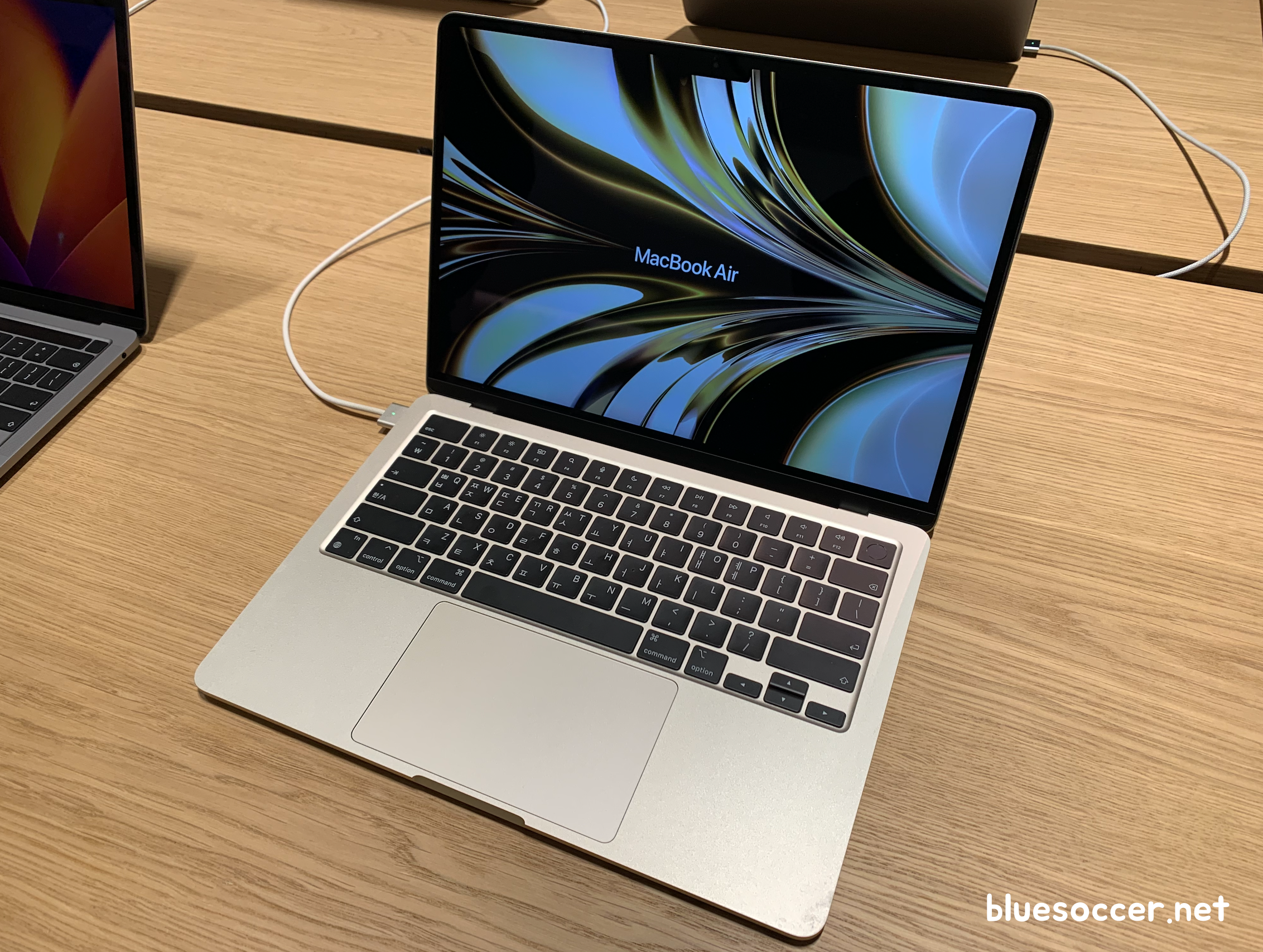 맥북에어 M2 색상 스타라이트 모델도 봤습니다. 언뜻보면 골드와 많이 유사한데 정식 네이밍은 다릅니다. 미드라이트에 비하면 주변 조명에 따라 제품의 빛깔이 다르게 보이긴 합니다. 그래서인지 어떨 때는 골드 같기도 하고 아닌 것 같기도 했습니다.