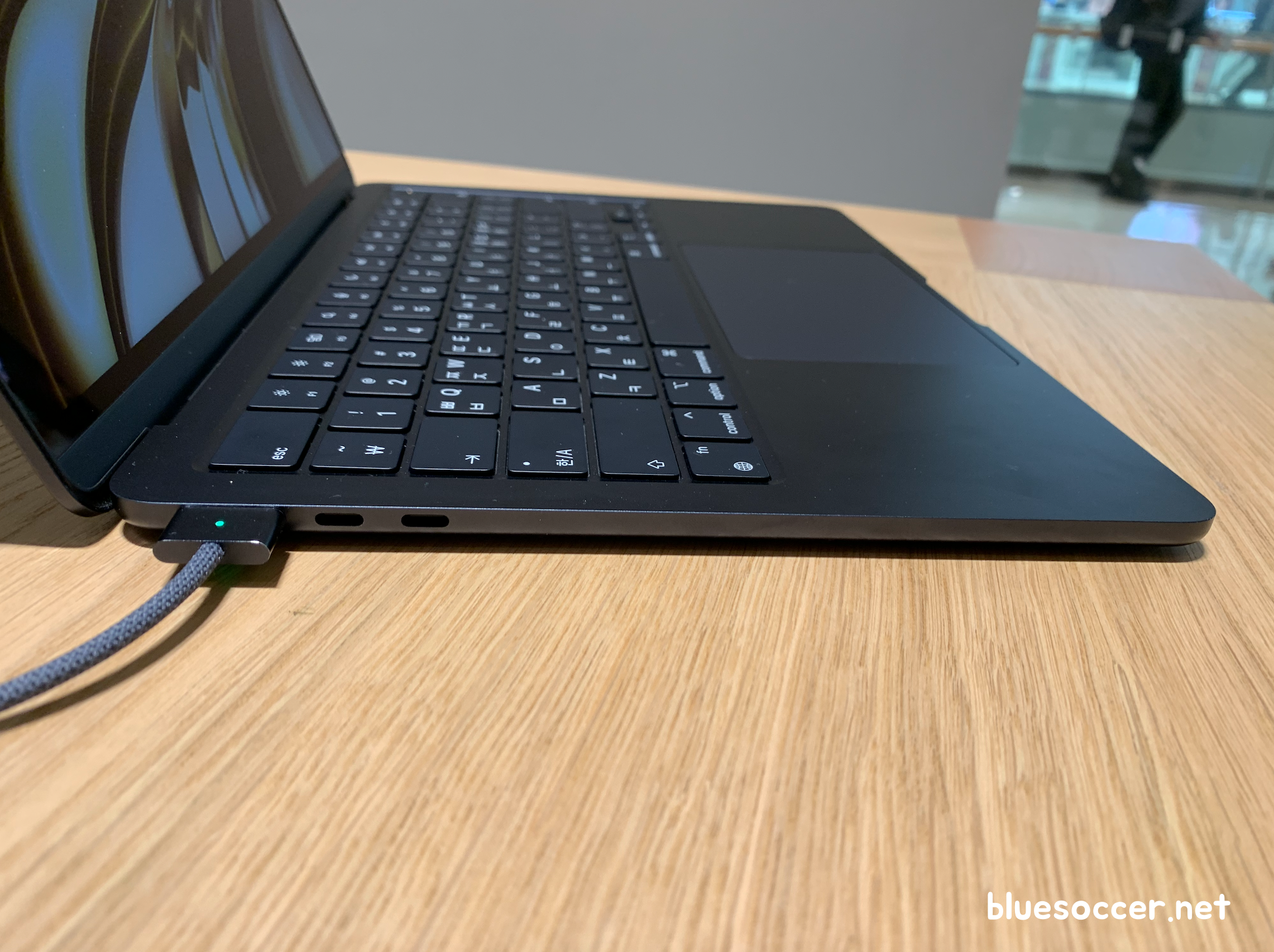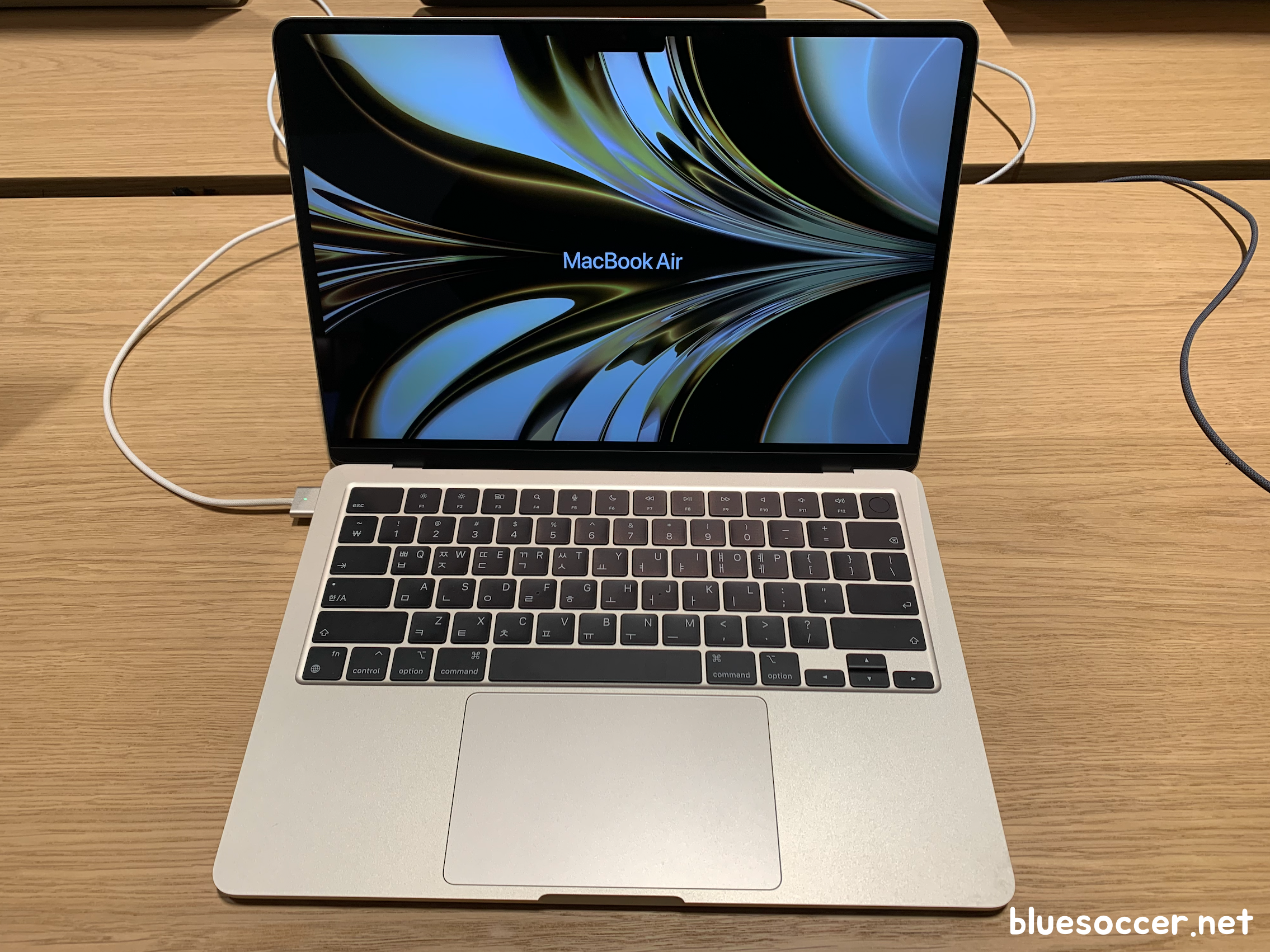 맥북에어 M2 색상 스타라이트 모델도 봤습니다. 언뜻보면 골드와 많이 유사한데 정식 네이밍은 다릅니다. 미드라이트에 비하면 주변 조명에 따라 제품의 빛깔이 다르게 보이긴 합니다. 그래서인지 어떨 때는 골드 같기도 하고 아닌 것 같기도 했습니다.