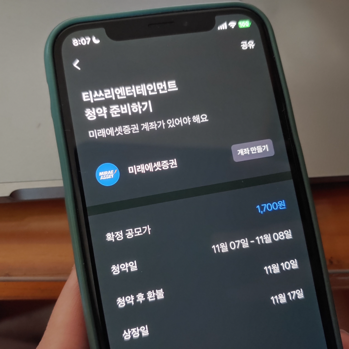 저는 지난달 초에 미래에셋증권 통해서 에스비비테크 공모주 청약 신청해서 균등 1주 받았습니다. 기억하시는 분들이 계시겠지만, 해당 종목은 상장 첫날에 따상에 근접한 추이를 나타냈습니다. 이번 11월 공모주들을 보면 미래에셋증권 계좌 보유해야 신청 가능한 종목이 여럿 있습니다. 그 중에 하나가 티쓰리엔터테인먼트 입니다. 11월 공모주 중에 미래에셋증권 통해서 청약 신청되는 다른 종목은 유비온(11월 8일~9일) 엔젯(11월 9일~10일) 밀리의서재(11월 10일~11일) 미래에셋드림스팩1호(11월 14일~15일)가 있습니다. 그 이전에는 윤성에프앤씨(11월 2일~3일)도 있었습니다.
