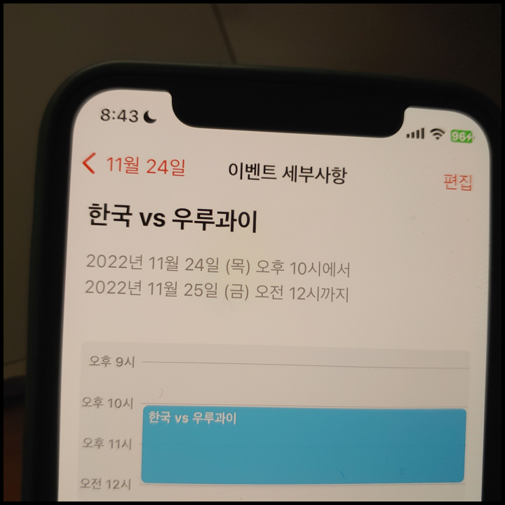 [사진 = 한국 우루과이 축구 맞대결은 국내 시간 기준으로 11월 24일에 펼쳐진다. 카타르 월드컵 조별 본선 1차전 경기라는 점을 놓고 보면 양팀 모두 첫 경기에서 승점을 얻기 위해 최선을 다할 것으로 보인다. 다만, 양팀 모두 주력 선수의 부상이라는 불안 요소를 안고 있다.(한국은 손흥민, 우루과이는 아라우호) 어쩌면 이 부분이 변수로 작용할지 모른다. 사진은 글쓴이 스마트폰 달력이며 11월 24일을 가리킨다. (C) 나이스블루]