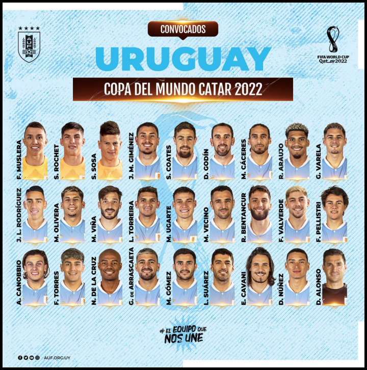 남미의 강호 우루과이 국가대표 명단 살펴보면 눈에 띄는 베테랑들이 여럿 있다. A매치 100경기 이상 출전했던 선수가 다섯 명 포함됐다. 디에고 고딘(159경기) 루이스 수아레스(134경기) 에딘손 카바니(133경기) 페르난도 무슬레라(133경기) 마르틴 카세레스(115경기)가 우루과이 축구 국가대표 명단 포함된 것. 카세레스를 제외한 4명은 2010 남아공 월드컵 16강 한국전에 출전했으며 그중에 수아레스가 2골을 넣으며 한국전 2-1 승리를 이끌었다. 카세레스 같은 경우 당시 대회 최종 엔트리에 포함됐으나 한국전에는 결장했다.