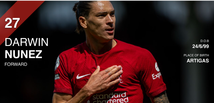 [사진 = 우루과이 국가대표 명단 포함된 다윈 누녜스는 한국의 경계대상 1호로 꼽히는 리버풀 공격수다. 전 소속팀인 벤피카 시절이었던 2021/22시즌 41경기 34골 및 유럽축구연맹(UEFA) 챔피언스리그 10경기 6골 넣는 맹활약을 펼쳤다. 그중에 두 골을 리버풀 상대로 넣었으며 이제는 리버풀의 새로운 일원이 됐다. (C) 리버풀 공식 홈페이지 프로필 사진(liverpoolfc.com)]