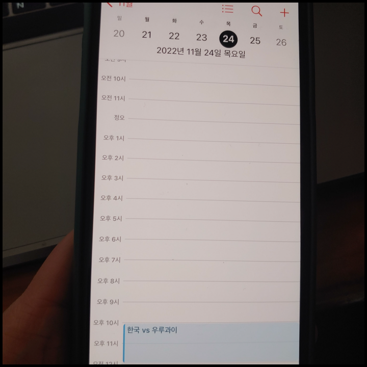 [사진 = 한국 우루과이 축구 맞대결은 국내 시간 기준으로 11월 24일에 펼쳐진다. 카타르 월드컵 조별 본선 1차전 경기라는 점을 놓고 보면 양팀 모두 첫 경기에서 승점을 얻기 위해 최선을 다할 것으로 보인다. 다만, 양팀 모두 주력 선수의 부상이라는 불안 요소를 안고 있다.(한국은 손흥민, 우루과이는 아라우호) 어쩌면 이 부분이 변수로 작용할지 모른다. 사진은 글쓴이 스마트폰 달력이며 11월 24일을 가리킨다. (C) 나이스블루]