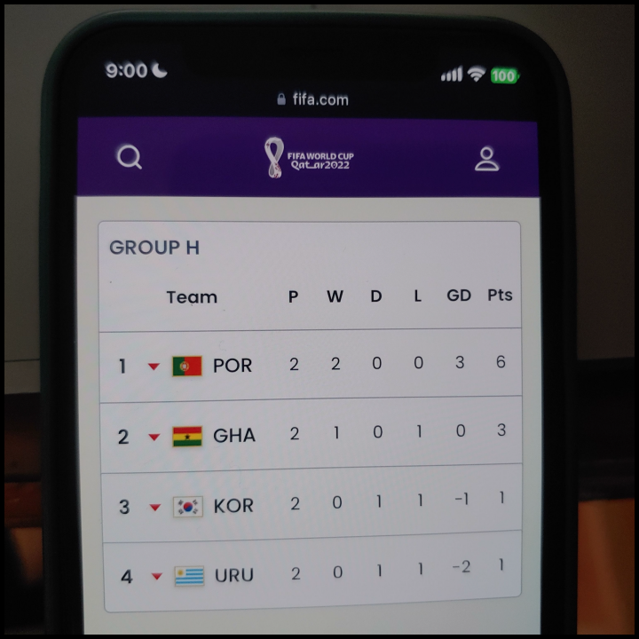 [사진 = 2022 카타르 월드컵 H조 2차전까지의 순위. 한국은 우루과이와 승점 1점 동률이며 서로 3~4위 기록중이다. 우리나라 입장에서는 우루과이가 가나를 제압하길 바랄 수 밖에 없다. (C) 국제축구연맹(FIFA) 공식 홈페이지(fifa.com)]