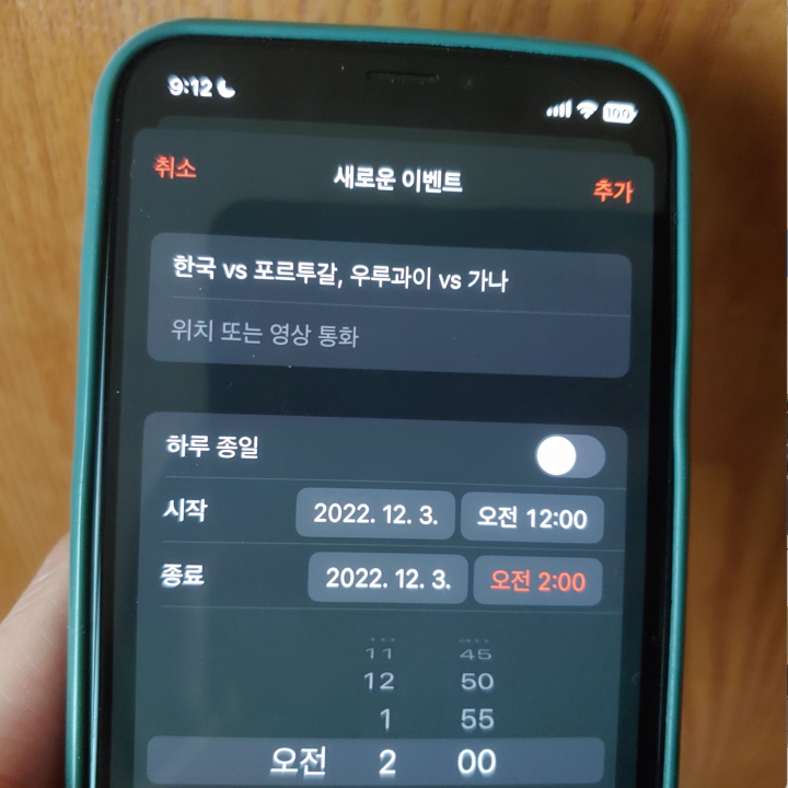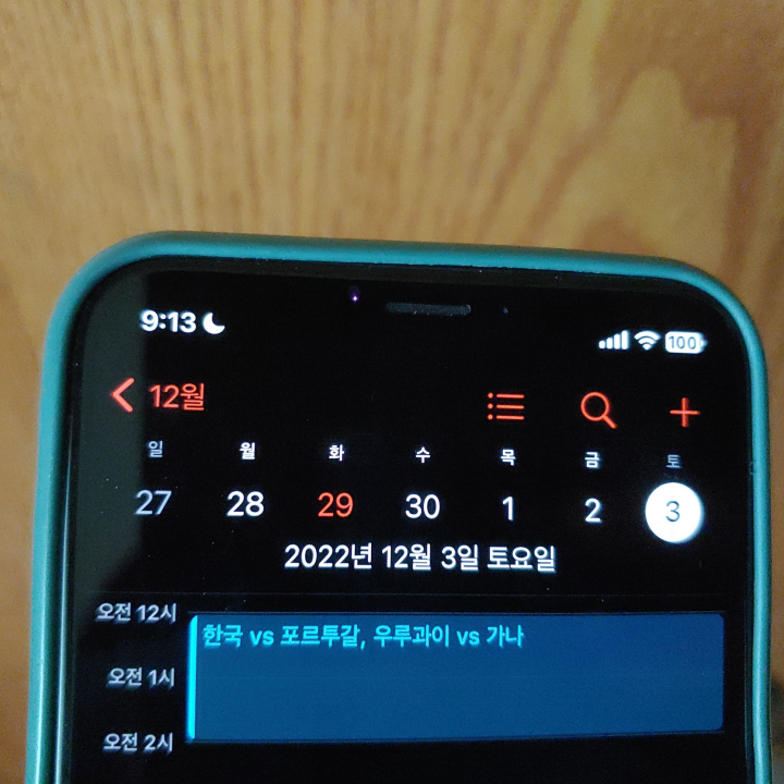[사진 = 한국 포르투갈, 그리고 우루과이 가나 맞대결이 2022년 12월 3일 오전 0시 펼쳐진다. 사진은 글쓴이 스마트폰 달력이며 해당일을 가리킨다. (C) 나이스블루]