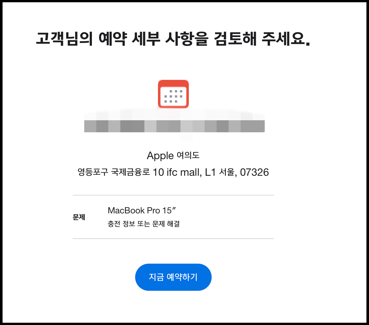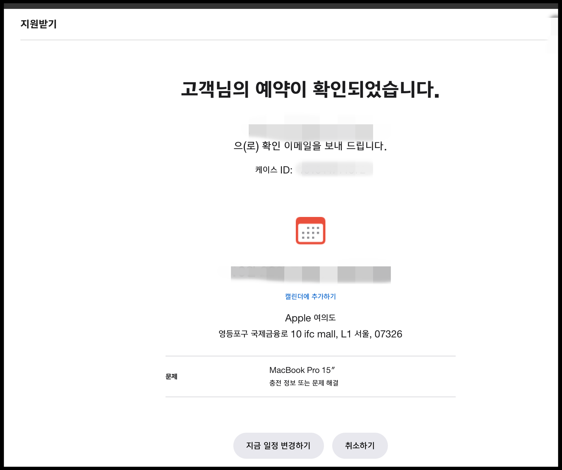 이렇게 여의도 애플스토어 예약 완료했습니다. 이렇게 하면 특정 요일 및 시간에 방문한다는 것을 매장 측에서도 알기 때문에 그에 맞게 대응할 수 있습니다. 저로서도 편리하게 방문할 수 있습니다. 실제로 매장에 아이폰이나 아이맥 수리 받으러 오는 모습을 봤는데 매장에서도 많이 바쁠 겁니다. 되도록이면 애플 공식 홈페이지를 통해 예약을 꼭 하셔서 방문한 뒤에 제품을 맡길 필요가 있습니다. 그래서 기다리는 시간 없이 바로 제품 맡겼습니다.