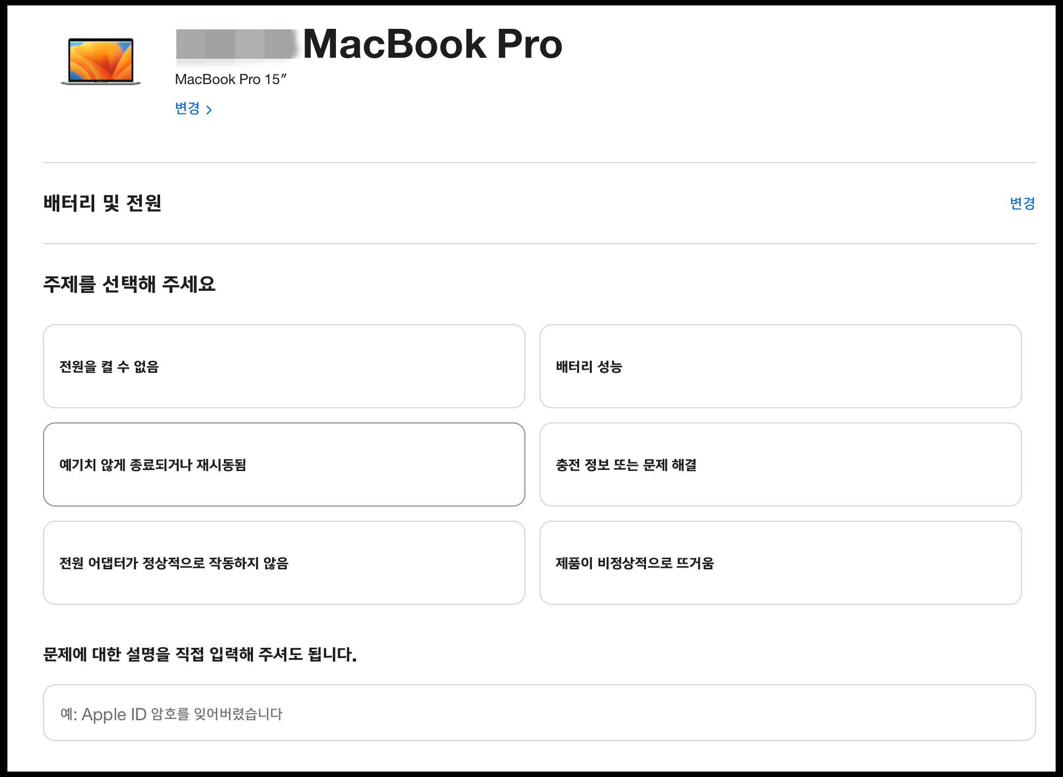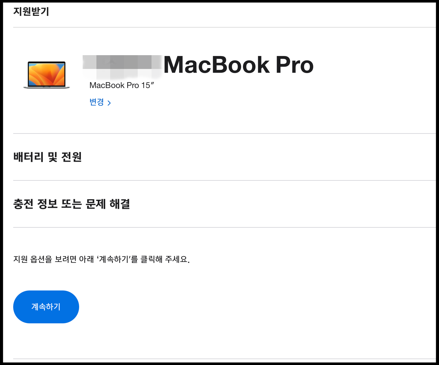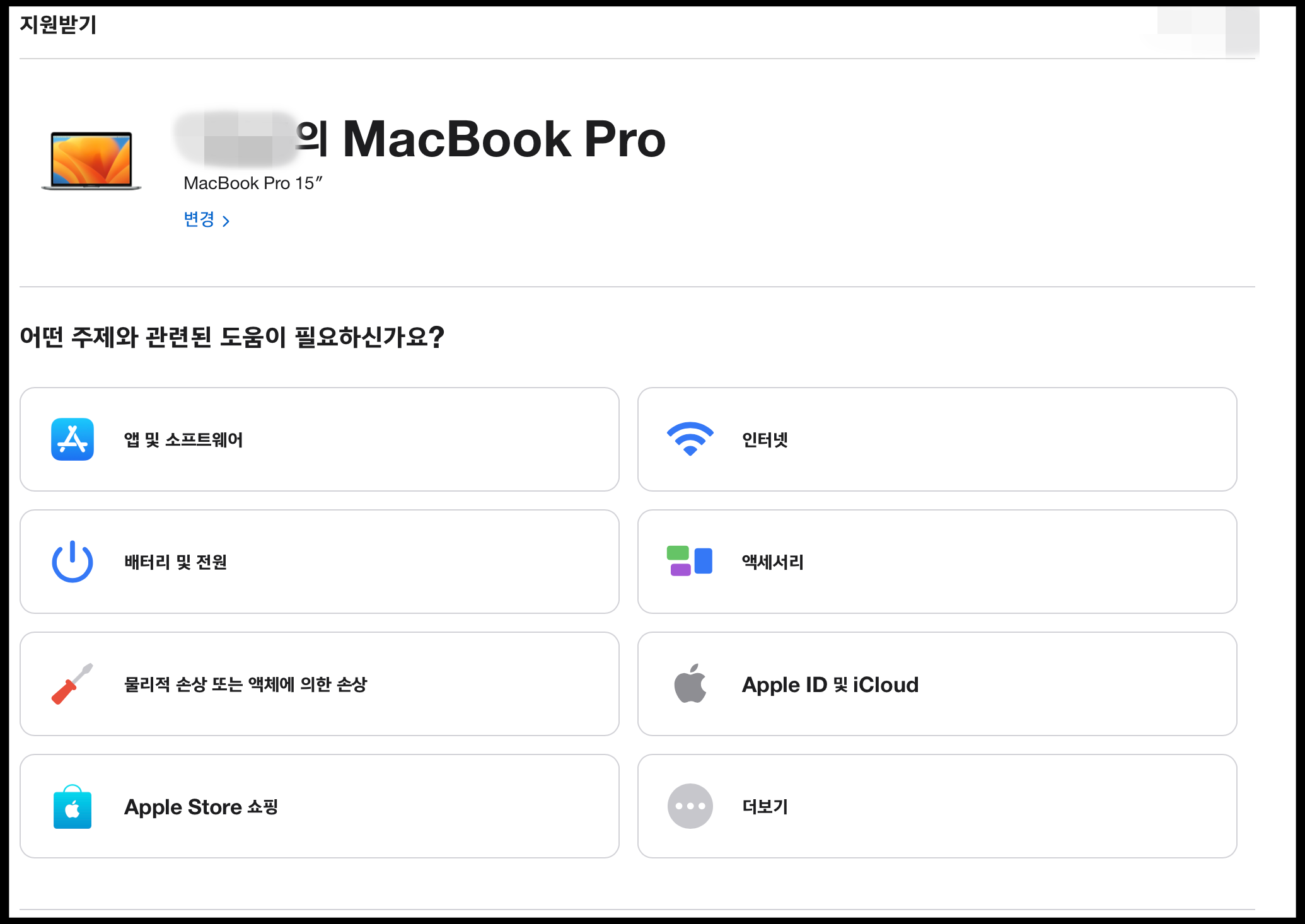 지원받기를 통해서 제가 현재 사용중인 애플 제품 목록들이 뜹니다. 이전에는 아이패드 에어2도 있었는데 이제는 더 이상 사용하지 않으므로 목록에 없습니다.