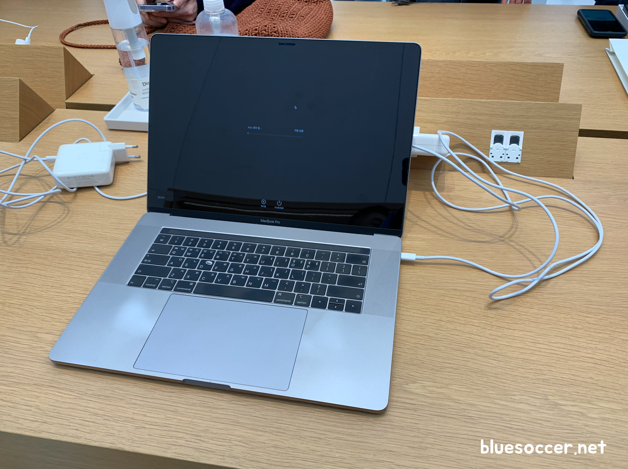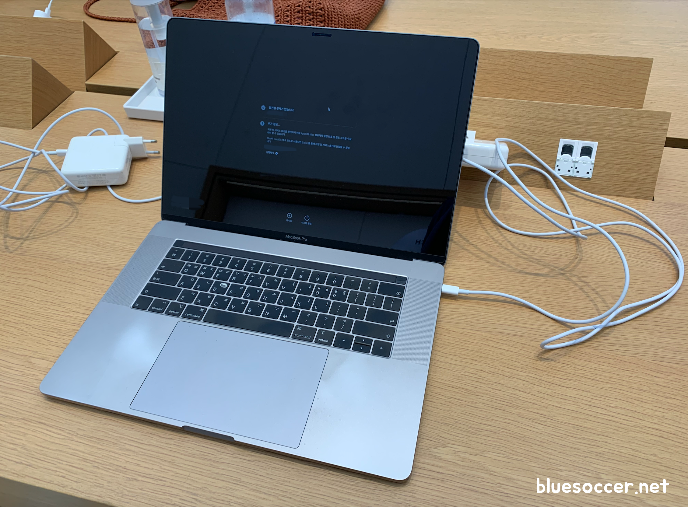 여의도 애플스토어 예약 및 방문을 한 뒤에 제품을 맡겼습니다. 우선은 맥북 점검을 받았습니다. 과연 기기에 이상이 있는지 살펴봤는데 다행히 없었습니다. 이 과정에서 제품 충전이 가능한 것을 알 수 있었습니다. 그 이유는 콘센트 및 어댑터가 제가 평소에 사용했던 제품이 아닌 애플스토어에서 점검 목적으로 쓰는 제품들입니다. 기기에 이상 없다면 저의 콘센트 및 어댑터에 문제가 있음을 알 수 있습니다. 콘센트는 이미 새로운 제품으로 바꿨으므로 어댑터 이상 가능성이 높았습니다.
