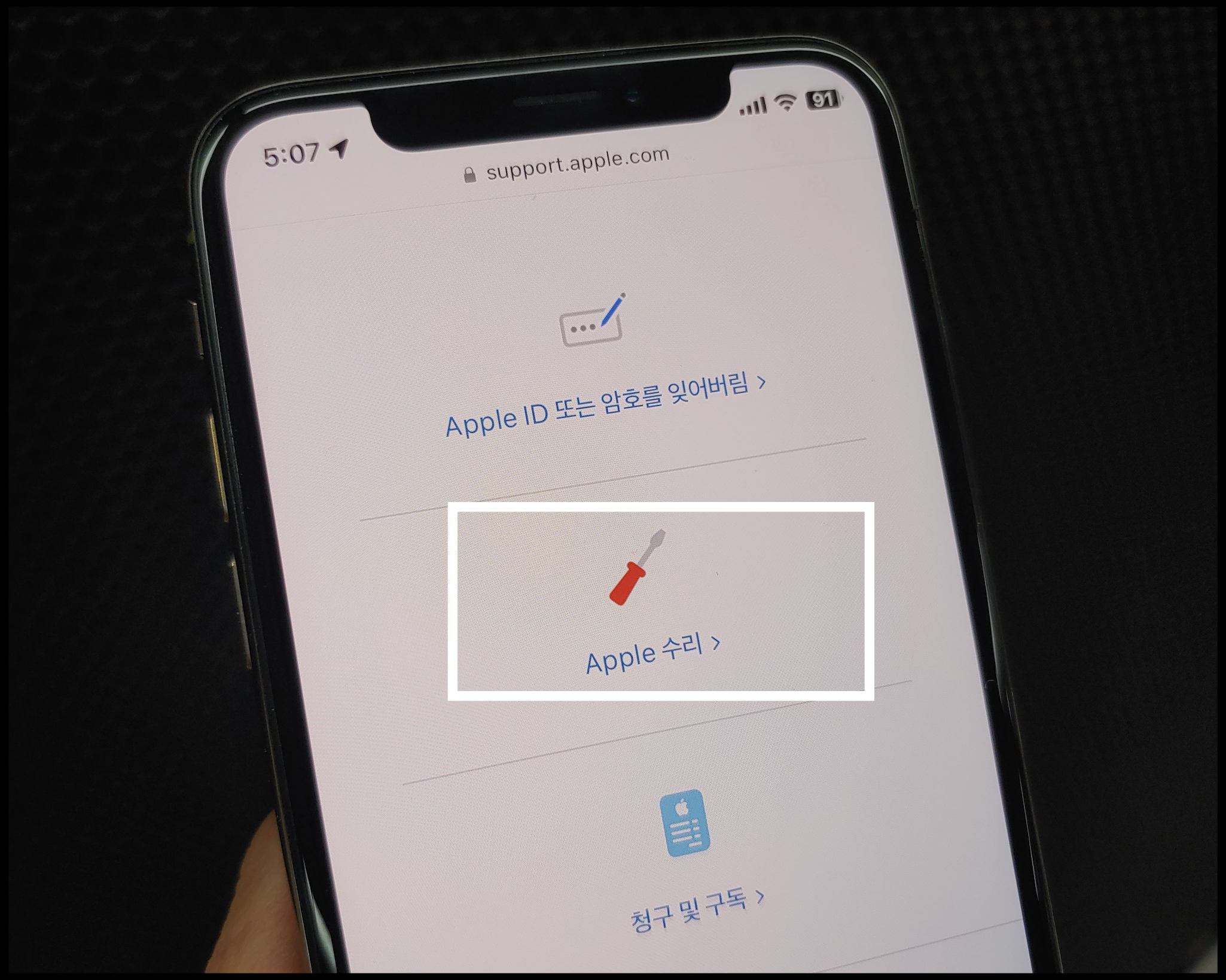 애플 공식 홈페이지 접속하시면 주요 메뉴에 애플 기기(맥, 아이패드, 아이폰, 워치 등)들이 뜨는 모습을 볼 수 있습니다. 모바일 화면 기준으로는 그 밑에 고객지원 메뉴가 있습니다. 그곳으로 들어가시면 또 다른 메뉴들이 있습니다. 'Apple 수리' 메뉴로 들어가시면 됩니다.