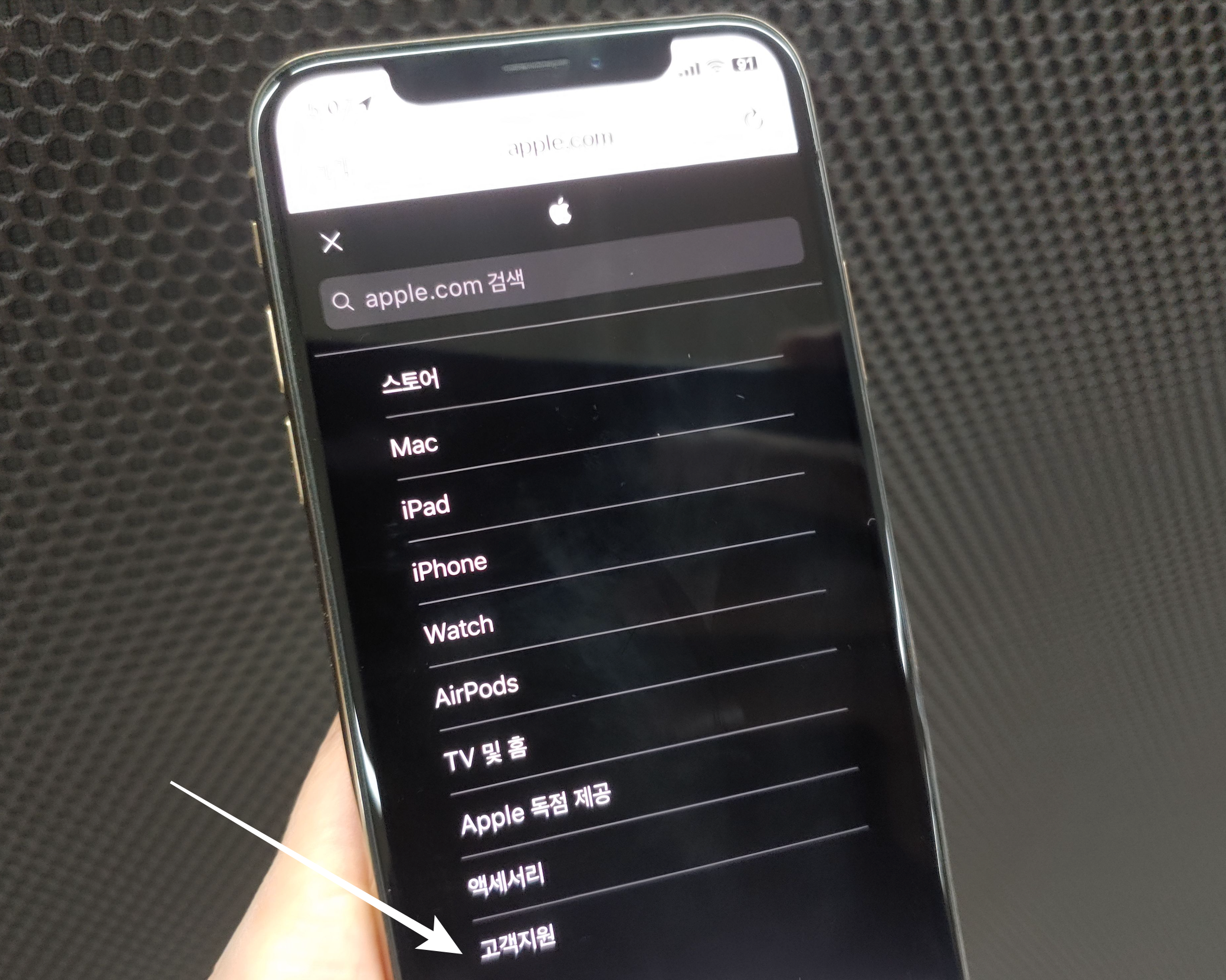 애플 공식 홈페이지 접속하시면 주요 메뉴에 애플 기기(맥, 아이패드, 아이폰, 워치 등)들이 뜨는 모습을 볼 수 있습니다. 모바일 화면 기준으로는 그 밑에 고객지원 메뉴가 있습니다. 그곳으로 들어가시면 또 다른 메뉴들이 있습니다. 'Apple 수리' 메뉴로 들어가시면 됩니다.