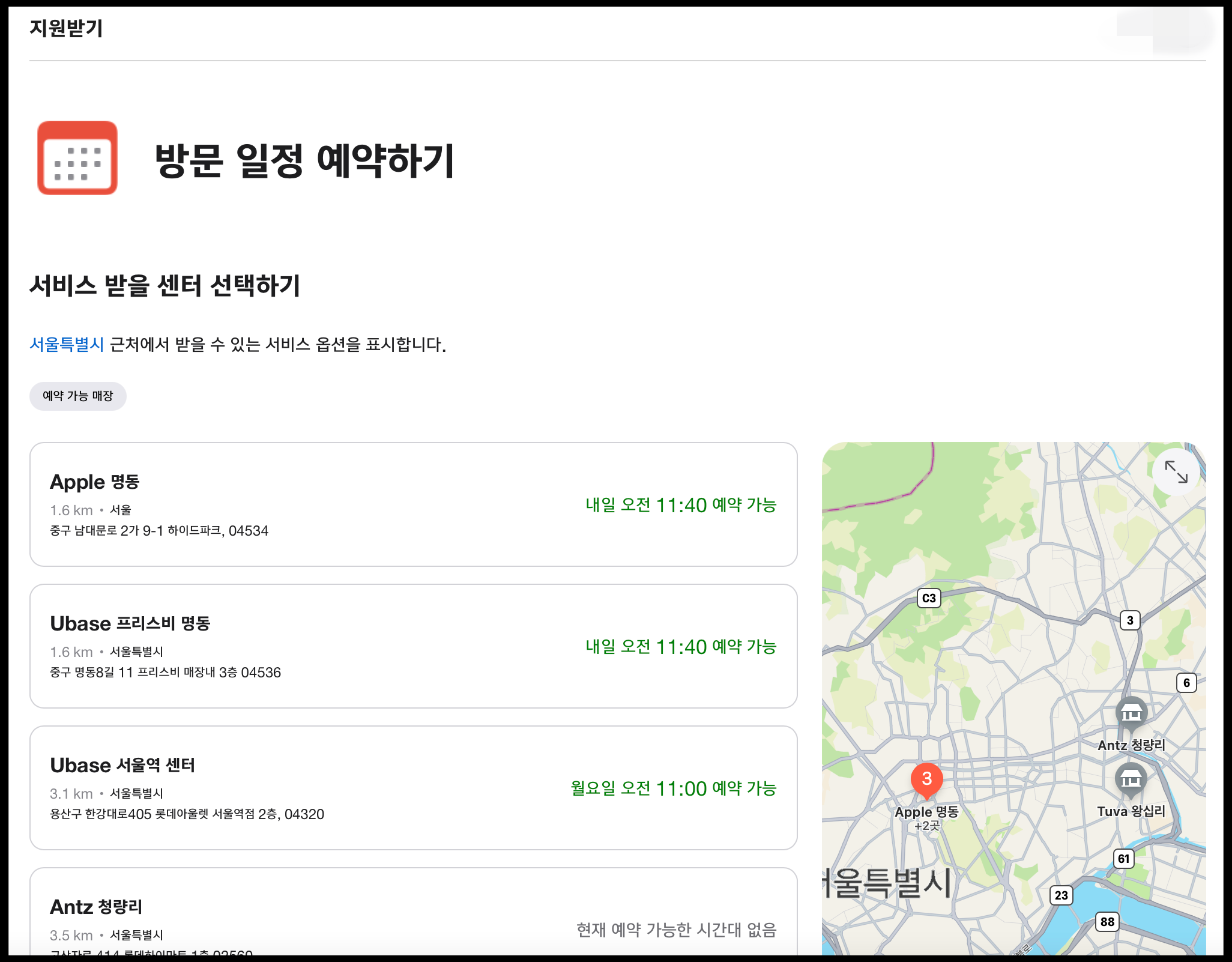 그 이후 방문 일정 예약하시면 됩니다. 저에게 편리한 시간에 방문하면 되는데 각 센터마다 예약 가능한 시간대가 다릅니다. 그러고보니 애플 서비스센터와 가까운 곳에 거주하는 분들은 편하게 방문하실 듯합니다. 최근에 애플스토어 매장이 늘어나는 모습을 보면서 느낀건, 저 같이 애플 제품을 주로 이용하는 사람이라면 나중에 집을 알아볼 때 애플스토어 매장과의 접근성을 따지는 분들도 있을지 모릅니다. 애플 제품을 이용하면서 언젠가는 수리 받아야 하는 상황이 올지 모르니 말입니다.