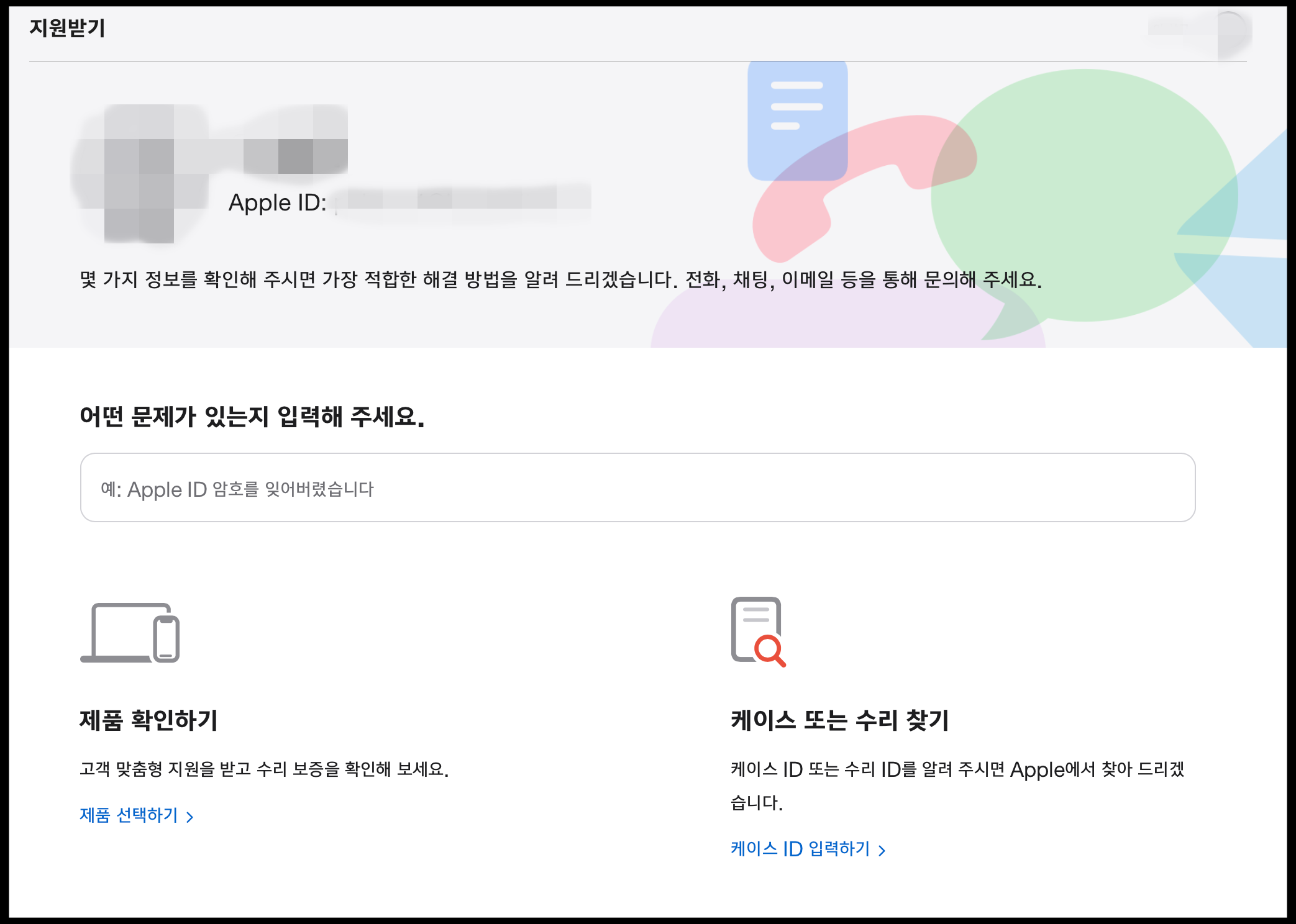 지원받기를 통해서 제가 현재 사용중인 애플 제품 목록들이 뜹니다. 이전에는 아이패드 에어2도 있었는데 이제는 더 이상 사용하지 않으므로 목록에 없습니다.