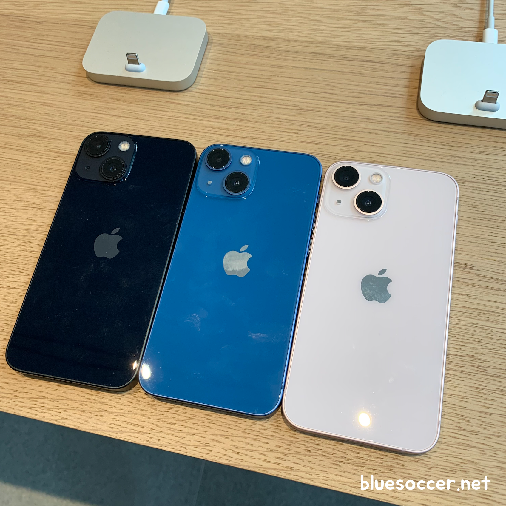 애플 아이폰13 미니 색상 6종이며 사진에서는 3종이 차례대로 나열된 모습을 볼 수 있습니다. 왼쪽부터 미드나이트, 블루, 스타라이트 색상입니다.