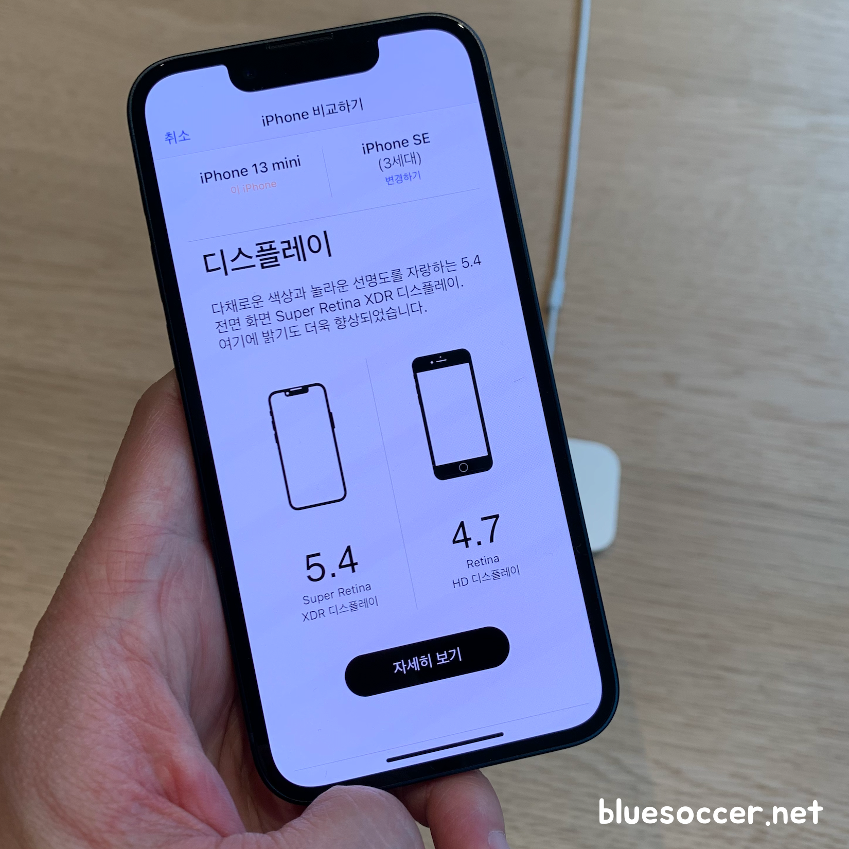 아이폰13 미니 크기 작으나 홈 버튼이 없기 때문에 디스플레이 크기 5.4인치가 됩니다. 오히려 예전 아이폰 폼펙터로 제작된 아이폰se 3세대 디스플레이 크기 4.7인치보다 더 넓습니다. 아이폰se 3세대 같은 경우 홈 버튼 있습니다.