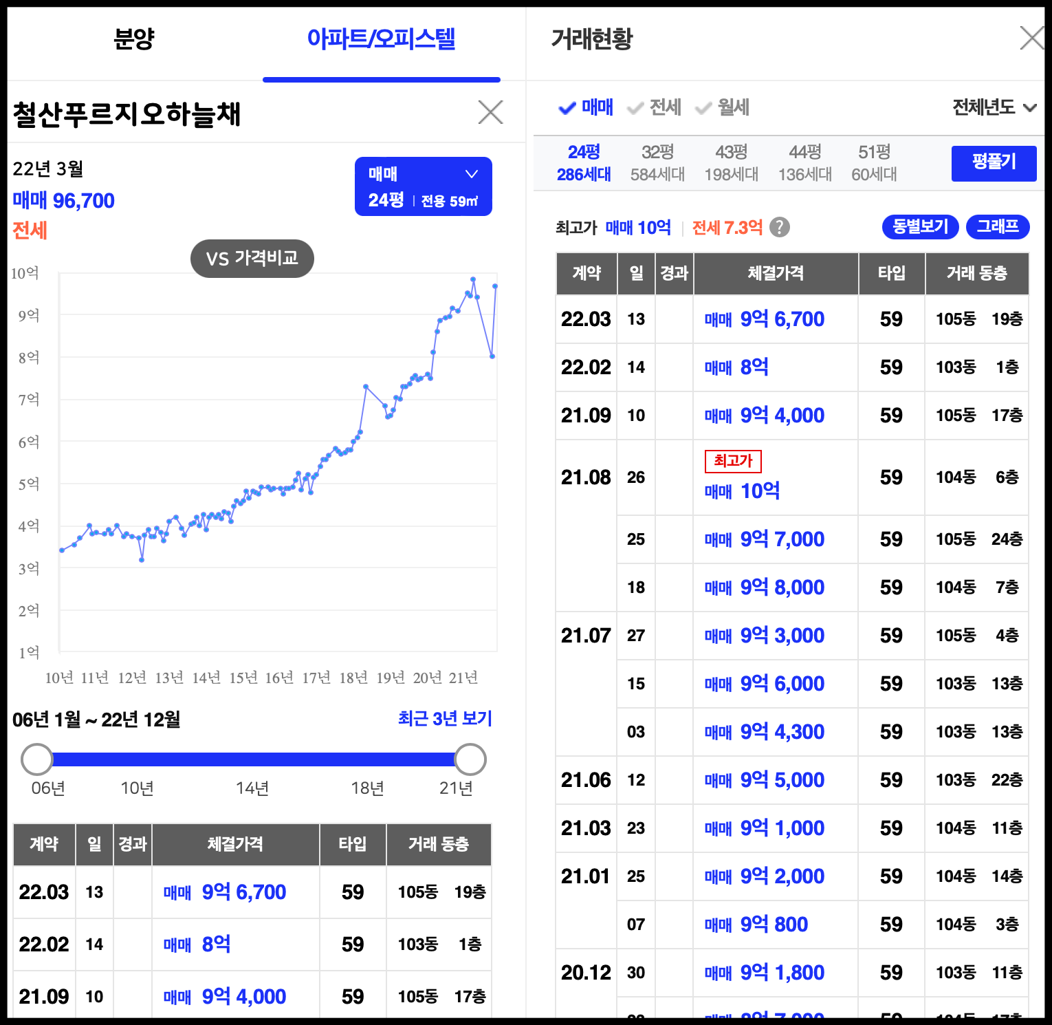 [사진 = 철산역 밑에 있는 대단지 아파트 철산푸르지오하늘채(1,264세대, 2010년 2월 준공) 철산래미안자이아파트(2,072세대, 2009년 11월 준공) 59타입과 84타입의 최근 실거래 내역 이렇습니다. 이를 통해서 철산자이 더 헤리티지 주변 시세가 어떤지 대략적으로 가늠할 수 있습니다. 이곳의 분양가가 예상보다 높다고 생각하시는 분이 있으실지 모르겠는데 바로 옆이 서울이자 가산디지털단지이기 때문에 직장인 출퇴근하기 좋은 이점이 있습니다. (C) 아실 홈페이지]