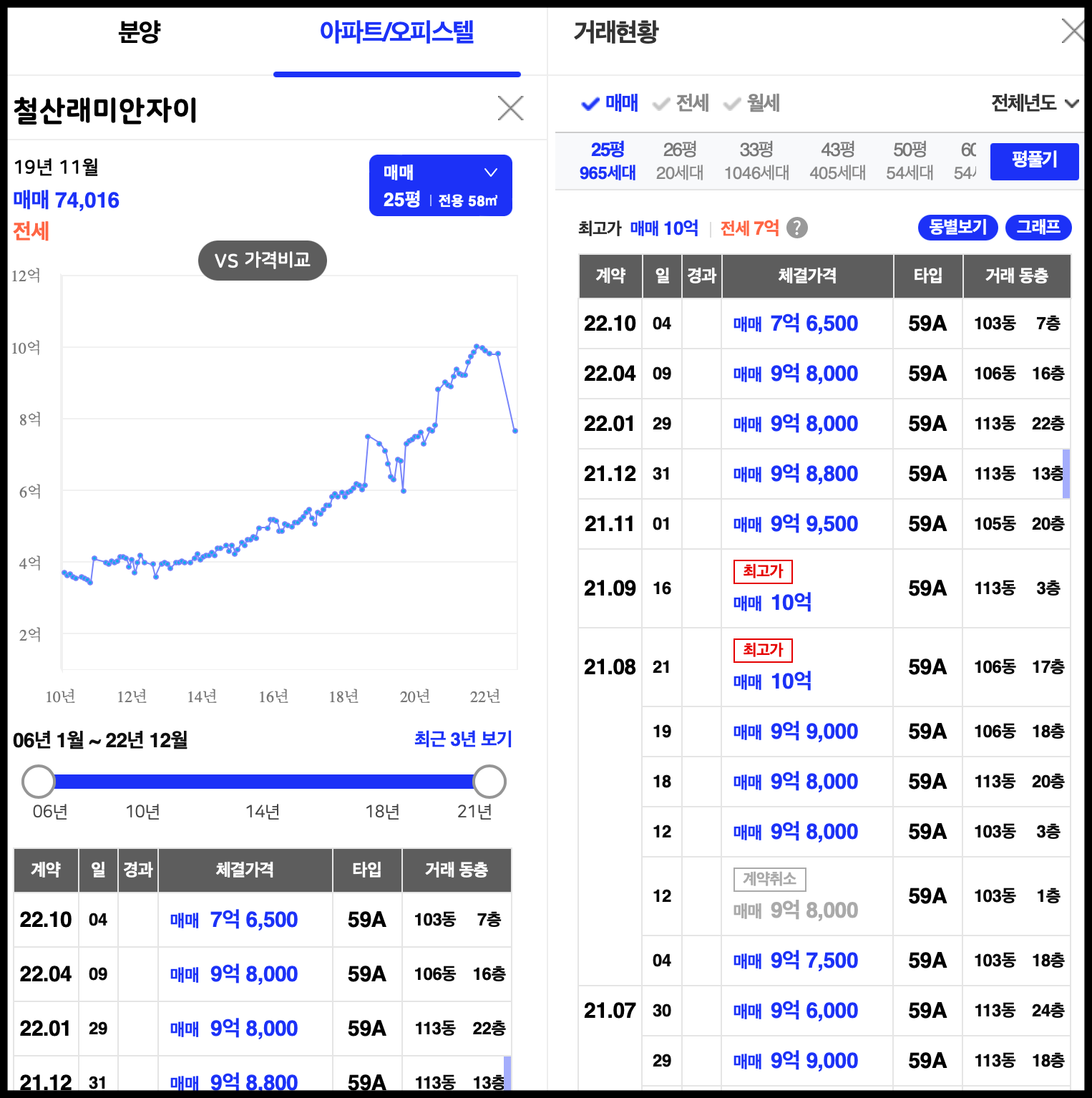 [사진 = 철산역 밑에 있는 대단지 아파트 철산푸르지오하늘채(1,264세대, 2010년 2월 준공) 철산래미안자이아파트(2,072세대, 2009년 11월 준공) 59타입과 84타입의 최근 실거래 내역 이렇습니다. 이를 통해서 철산자이 더 헤리티지 주변 시세가 어떤지 대략적으로 가늠할 수 있습니다. 이곳의 분양가가 예상보다 높다고 생각하시는 분이 있으실지 모르겠는데 바로 옆이 서울이자 가산디지털단지이기 때문에 직장인 출퇴근하기 좋은 이점이 있습니다. (C) 아실 홈페이지]