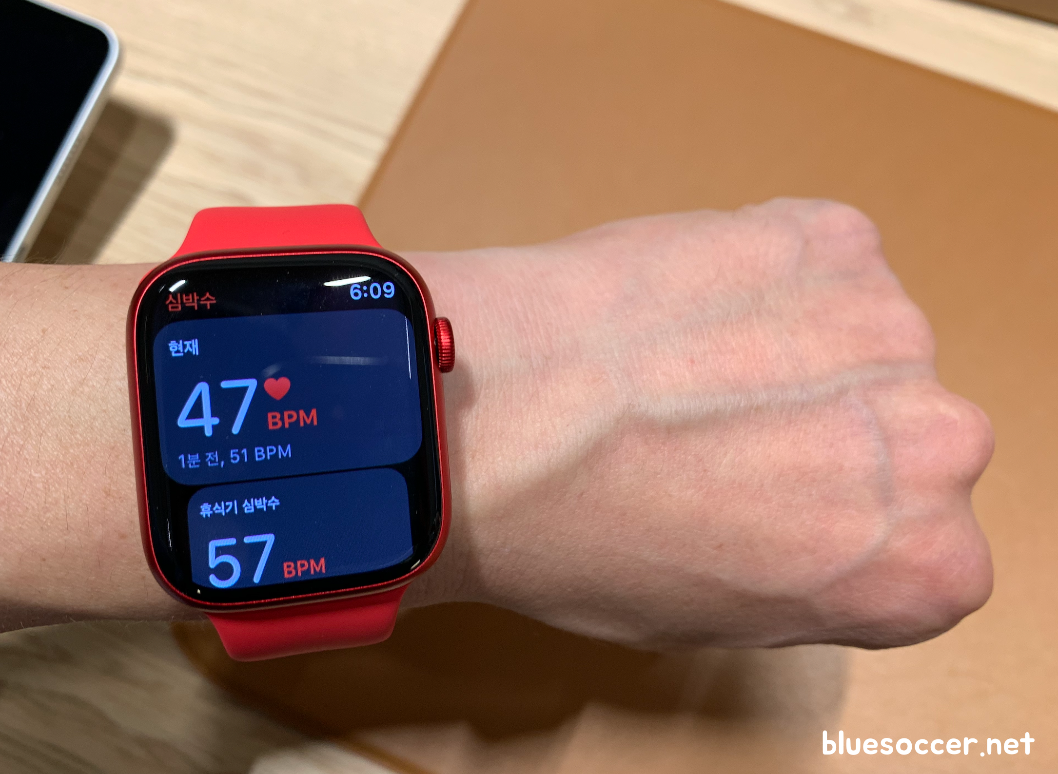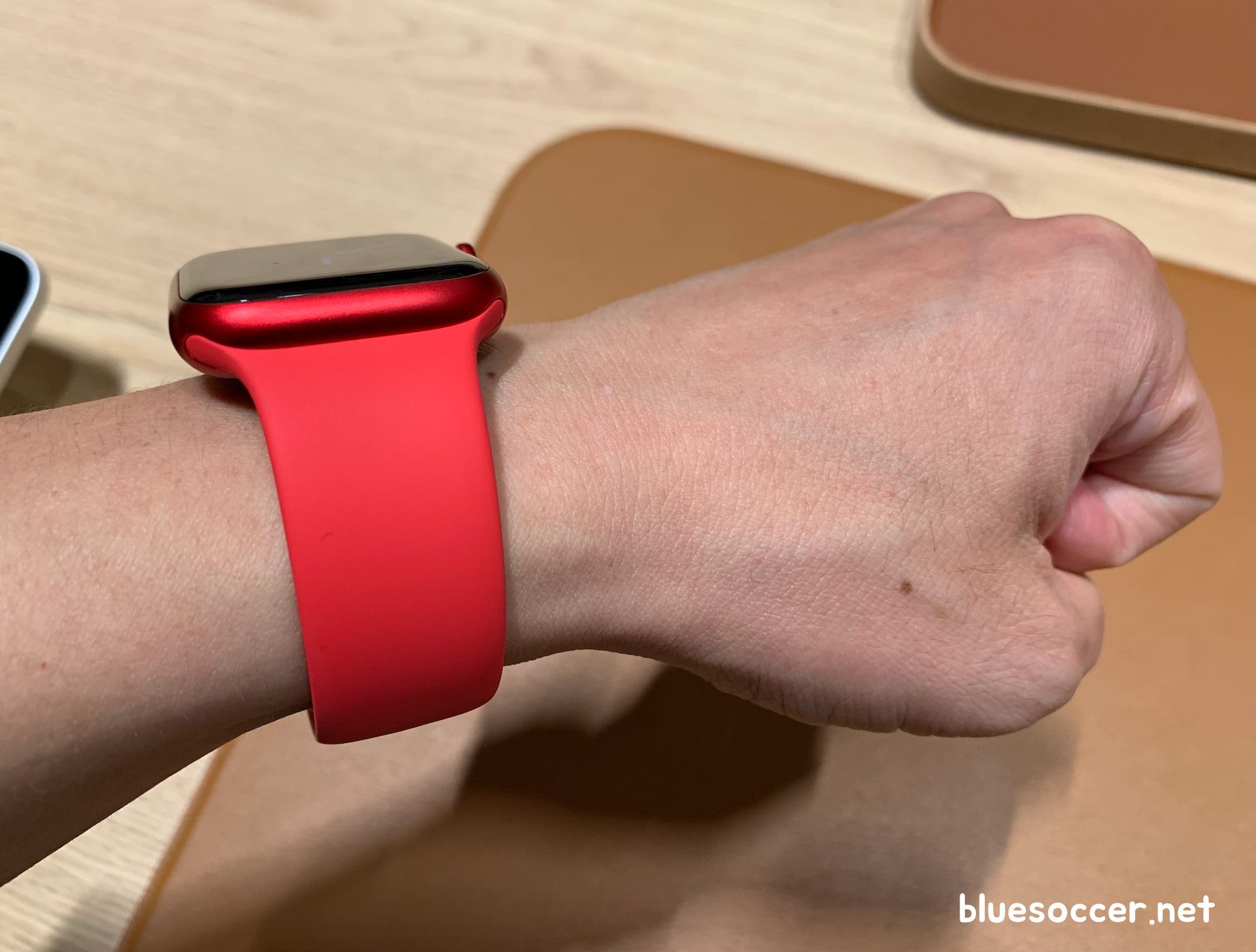애플워치8 45mm 프로덕트 레드 직접 착용했습니다. 개인적으로는 손목 두께가 두껍지 않아서 45mm 보다는 41mm이 적합했는데 45mm도 괜찮았습니다. 알루미늄 케이스라서 무게가 가벼웠을 뿐만 아니라 스포츠 밴드가 손목에 결합되었을 때의 느낌이 부드러웠습니다. 손목에 불편함을 느끼지 않았습니다.