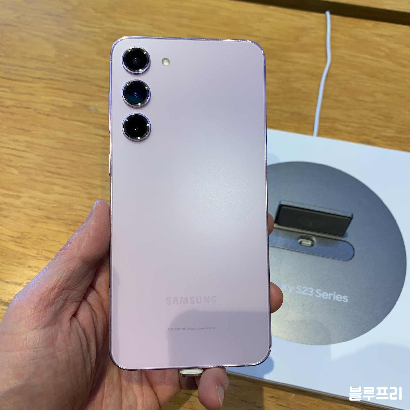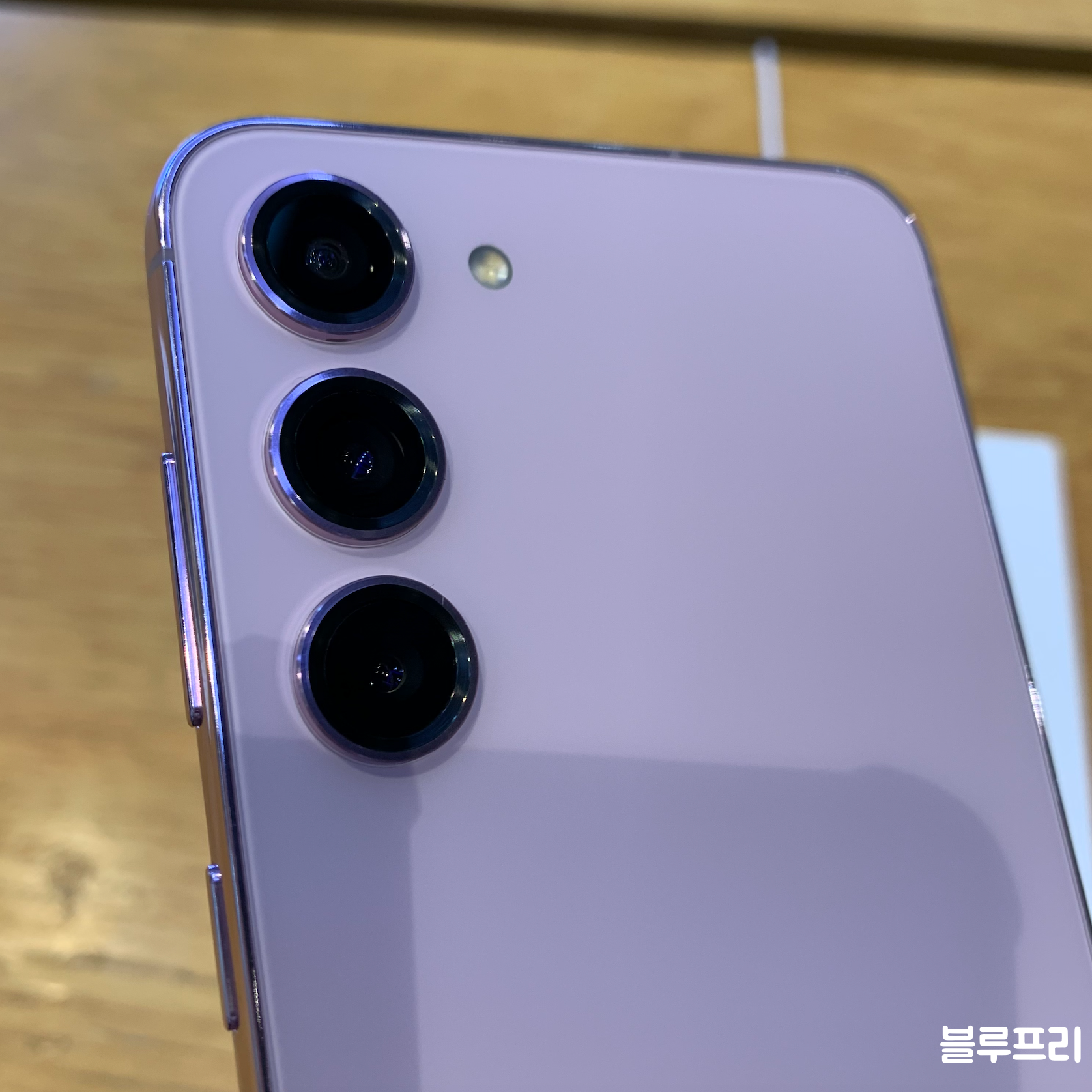 이번에는 갤럭시S23 플러스 라벤더 후면 모습입니다. 해당 색상도 일반형 및 울트라 모델에 기본으로 적용됐습니다. 아까전에 봤던 그린과는 다르게 밝은 톤이 인상적인 모델입니다.