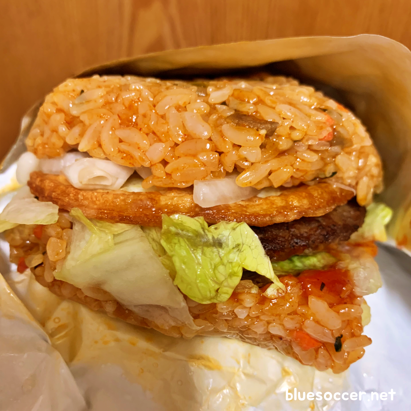 롯데리아 전주비빔 라이스버거 이렇습니다. 밥의 양이 생각보다 많았으며 아래쪽보다는 위쪽이 더 많아 보였던 인상입니다. 다만, 밥의 아래쪽이 조금 부서진 부분이 있었습니다. 이 부분 감안해서 섭취하시면 좋을 듯합니다.