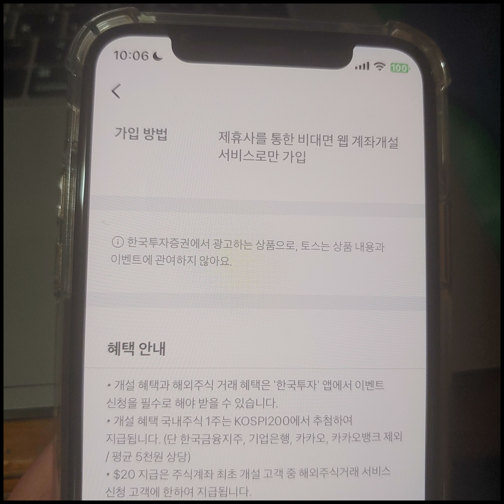 [사진 = 이번에 나노팀 공모주 청약 시 한국투자증권 계좌 새롭게 개설하고 싶을 때 토스 앱 혜택을 주목하시면 좋을 듯합니다. 개설 혜택으로서 국내주식 1주 및 20달러 지급됩니다. 해외주식 거래 혜택으로는 최대 400달러 지급한다고 합니다. 개설 혜택과 해외주식 거래 혜택은 한국투자 앱에서 이벤트 신청 필수로 하셔야 합니다. 개설 혜택 국내주식 1주는 KOSPI200 추첨 통해서 지급되며 일부 종목은 제외라고 합니다. 20달러 지급은 주식계좌 최초 개설 고객 중에 해외주식거래 서비스 신청 고객에 한해서라고 합니다. (C) 토스 앱]