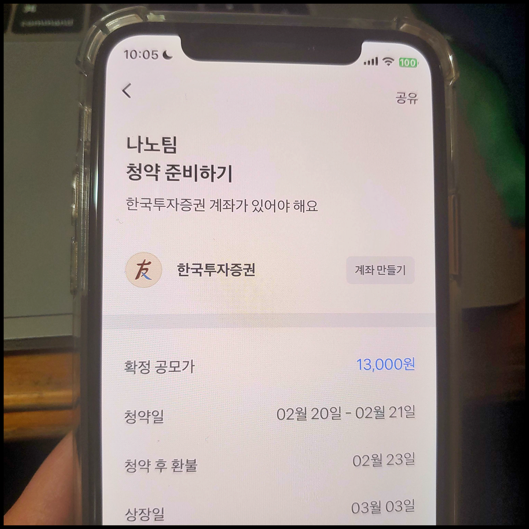 [사진 = 나노팀 공모주 청약 신청 한국투자증권에서 가능합니다. 해당 증권사가 주간사이기 때문입니다. (C) 한국투자증권 앱]
