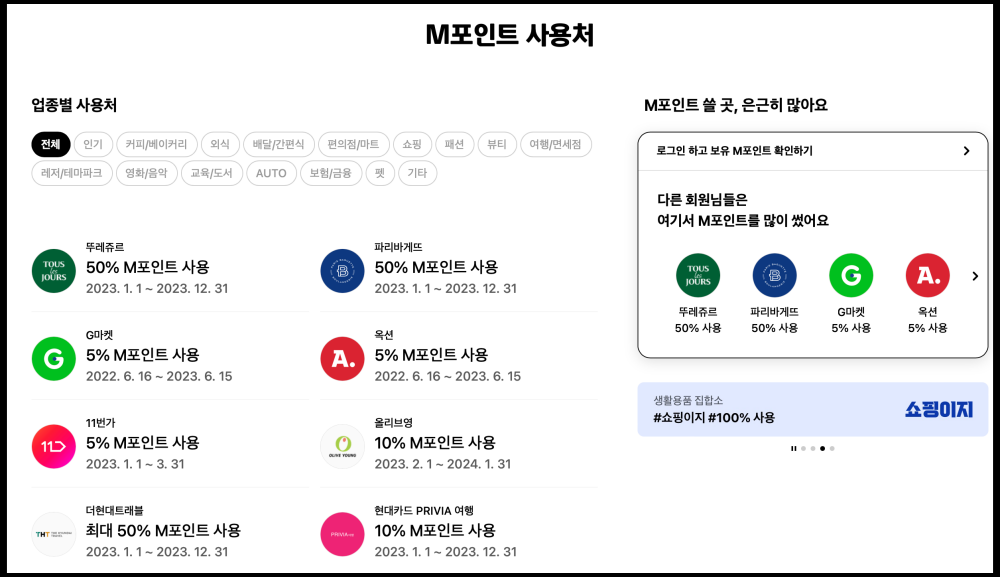[사진 = 현대카드 M포인트 사용처 다양합니다. 다양한 분야에서 활용할 수 있습니다. 다른 회원분들 중에는 뚜레쥬르, 파리바게뜨(이상 50% 사용) G마켓, 옥션(이상 5% 사용) 이용이 많았다고 합니다. (C) 현대카드 공식 홈페이지]