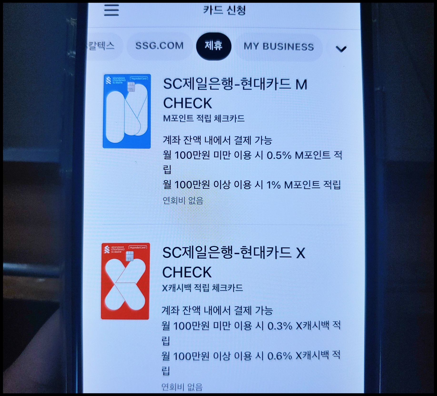 그럴 경우 현대카드 체크카드 애플페이 사용 가능한 대상으로서 SC제일은행-현대카드 M CHECK 또는 X CHECK 눈여겨 볼 필요가 있습니다. M CHECK는 0.5 ~ 1% M포인트 적립되며 X CHECK는 0.3 ~ 0.6% X캐시백 적립되는 차이점이 있습니다. 두 카드 모두 연회비는 국내전용/국내외겸용(VISA) 없다고 합니다. 현대카드에서도 발급 가능하며 연회비 없다고 나옵니다. 다만, 현대카드에서 발급하는 현대카드 M CHECK, X CHECK 연회비 2천 원 있는 차이점이 있습니다. 만약 현대카드에서 발급하실 때 해당 카드 앞에 'SC제일은행' 단어가 있는지 여부를 신경쓰셔야 합니다. 현대카드 체크카드 이용 관심 있으신 애플 유저 분이라면 말입니다.