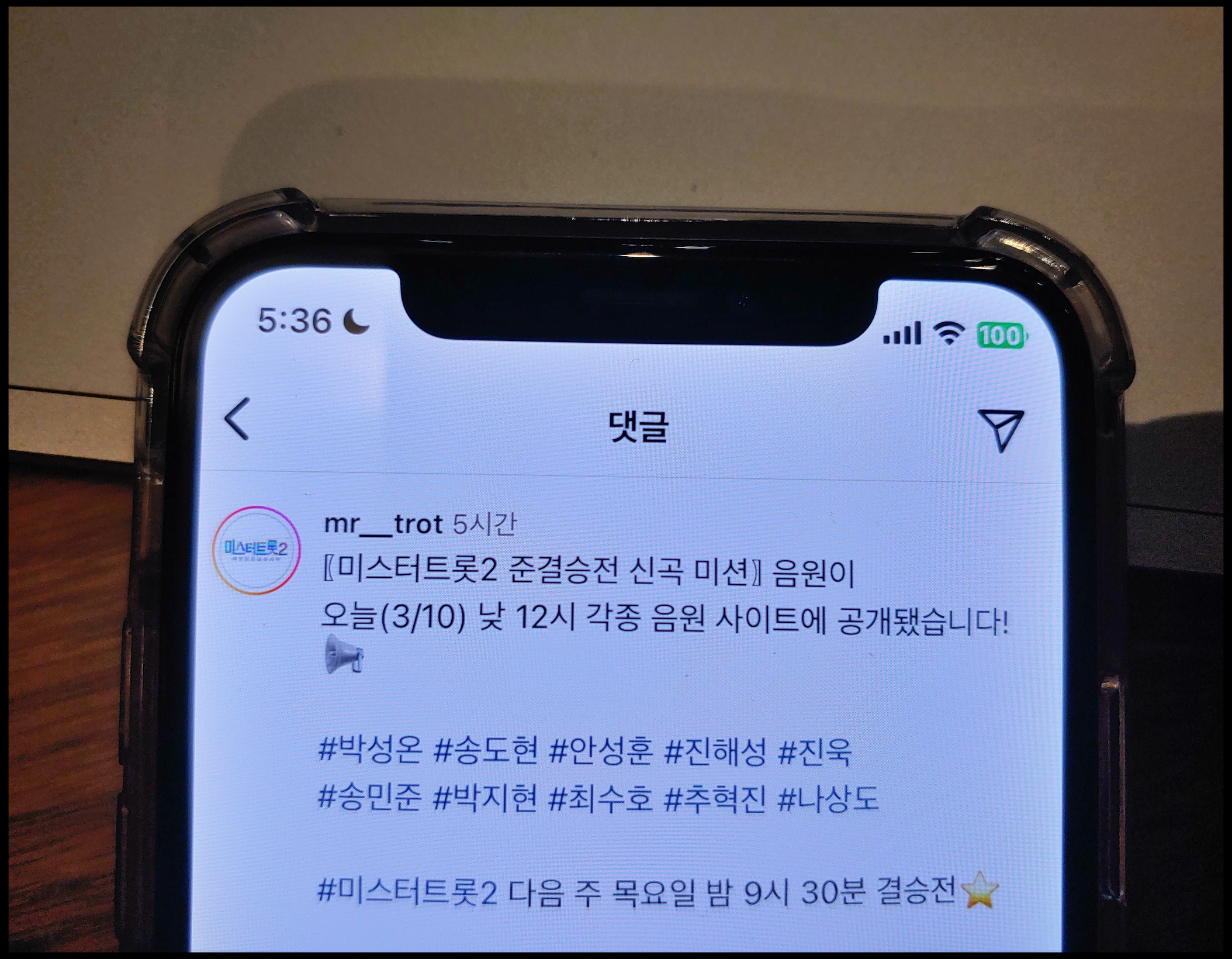 [사진 = 3월 10일 낮 12시에 각종 음원 사이트에서 미스터트롯2 준결승전 신곡 미션 음원 나왔습니다. (C) TV조선 미스터트롯2 공식 인스타그램, 애플뮤직 앱]
