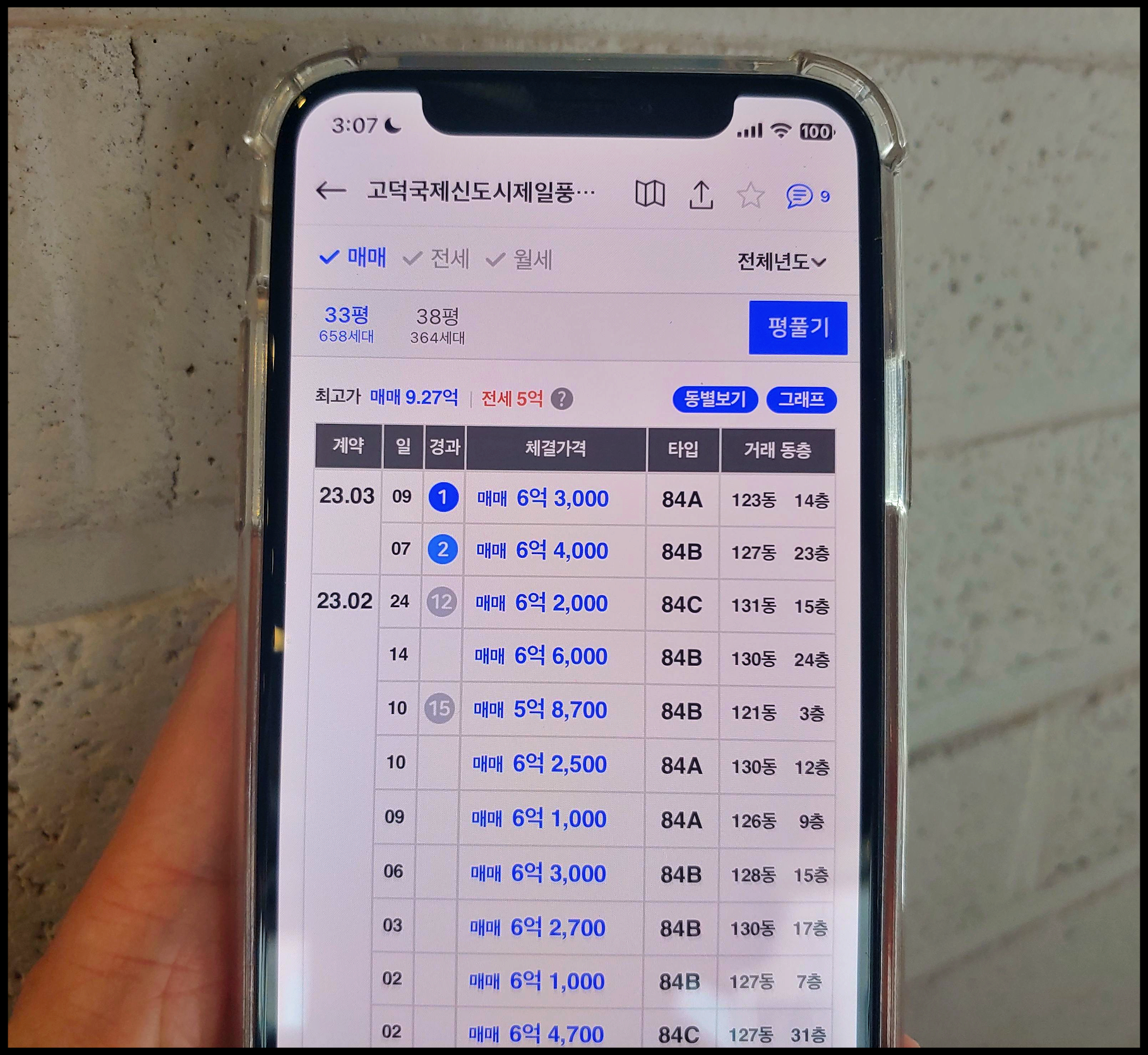 [사진 = 평택 고덕자이 센트로 분양가 과연 적정한 비용으로 책정되었는지 여부에 대해서는 주변 시세를 어느 정도 참고하면 좋을 듯합니다. 이곳 근처에 1,022세대 규모이면서 서정리역과 가까운 고덕국제신도시제일풍경채(2019년 11월 분양)가 있습니다. 84타입(33평)의 경우 이번달에 6억 3천만 원, 6억 4천만 원 거래된 적이 있습니다. 한때는 9억 2,700만 원까지 치솟았다가 1~2월에 5억 후반대 거래가 있었는데 이번 달에 6억 대로 올라왔습니다. (C) 아실(아파트 실거래가) 앱]