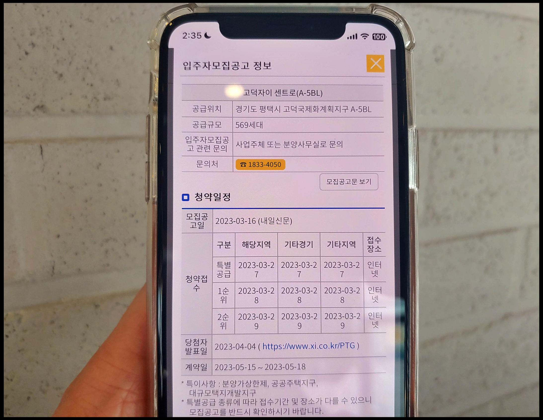 [사진 = 평택 고덕자이 센트로 청약 일정 살펴보면 이렇습니다. 2023년 3월 27일 월요일이 특별공급 청약일이며 그 다음날인 3월 28일 화요일이 일반 1순위, 3월 29일 수요일이 일반 2순위입니다. 당첨자는 4월 4일 화요일 발표되며, 당첨자 서류접수는 그 다음날인 4월 5일 수요일부터 4월 8일 토요일까지 진행됩니다. 당첨자 대상의 계약체결은 5월 15일 월요일부터 5월 18일 목요일까지라고 합니다. (C) 청약Home 앱]