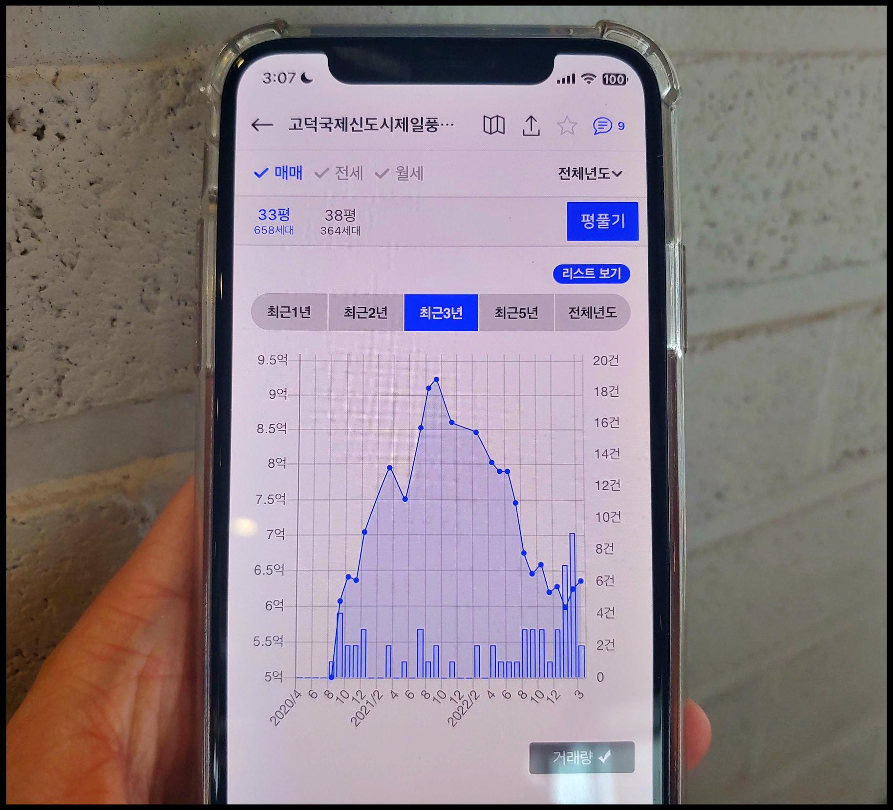 [사진 = 평택 고덕자이 센트로 분양가 과연 적정한 비용으로 책정되었는지 여부에 대해서는 주변 시세를 어느 정도 참고하면 좋을 듯합니다. 이곳 근처에 1,022세대 규모이면서 서정리역과 가까운 고덕국제신도시제일풍경채(2019년 11월 분양)가 있습니다. 84타입(33평)의 경우 이번달에 6억 3천만 원, 6억 4천만 원 거래된 적이 있습니다. 한때는 9억 2,700만 원까지 치솟았다가 1~2월에 5억 후반대 거래가 있었는데 이번 달에 6억 대로 올라왔습니다. (C) 아실(아파트 실거래가) 앱]
